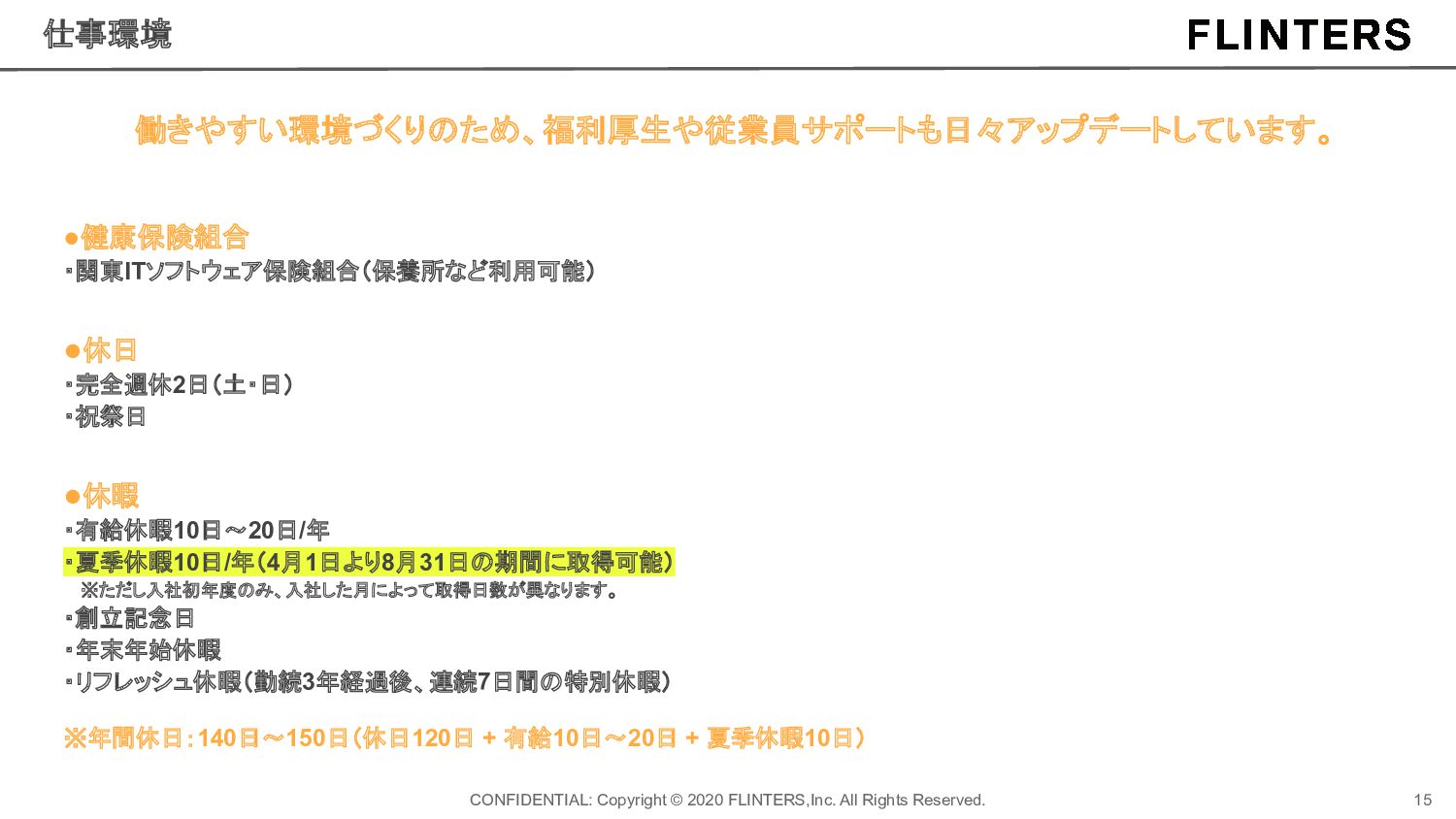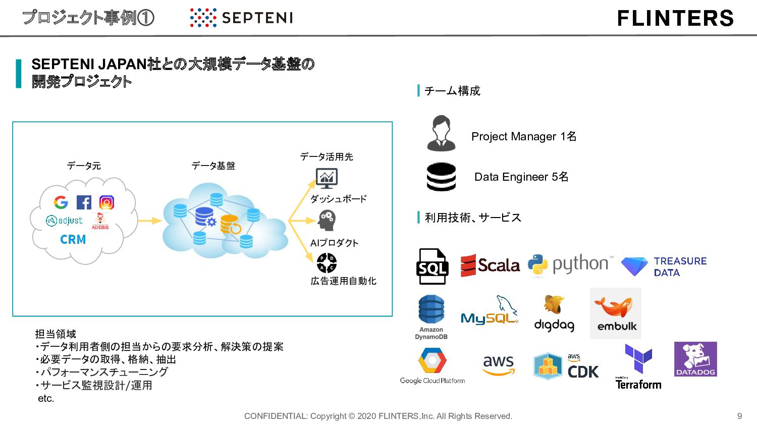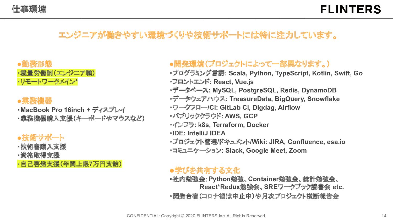 •勤務形態 ・裁量労働制(エンジニア職) ・リモートワークメイン* •業務機器 ・MacBook Pro 16inch + ディスプレイ ・業務機器購入支援(キーボードやマウスなど) •技術サポート ・技術書購入支援 ・資格取得支援 ・自己啓発支援(年間上限7万円支給) •開発環境(プロジェクトによって一部異なります。) ・プログラミング言語: Scala, Python, TypeScript, Kotlin, Swift, Go ・フロントエンド: React, Vue.js ・データベース: MySQL, PostgreSQL, Redis, DynamoDB ・データウェアハウス: TreasureData, BigQuery, Snowflake ・ワークフロー/CI: GitLab CI, Digdag, Airflow ・パブリッククラウド: AWS, GCP ・インフラ: k8s, Terraform, Docker ・IDE: IntelliJ IDEA ・プロジェクト管理/ドキュメント/Wiki: JIRA, Confluence, esa.io ・コミュニケーション: Slack, Google Meet, Zoom •学びを共有する文化 ・社内勉強会:Python勉強、Container勉強会、統計勉強会、 React*Redux勉強会、SREワークブック読書会 etc. ・開発合宿(コロナ禍は中止中)や月次プロジェクト横断報告会 エンジニアが働きやすい環境づくりや技術サポートには特に注力しています。