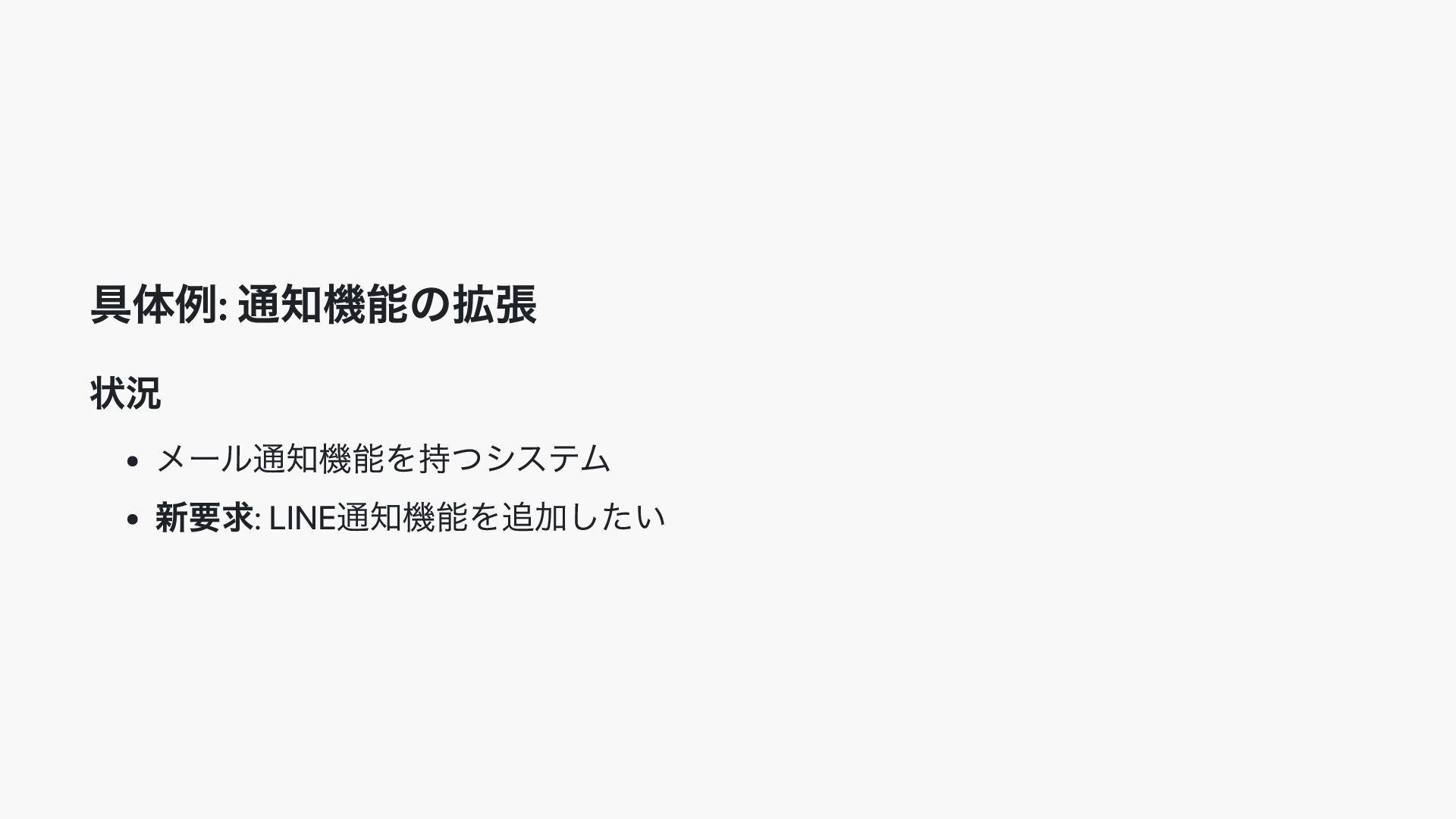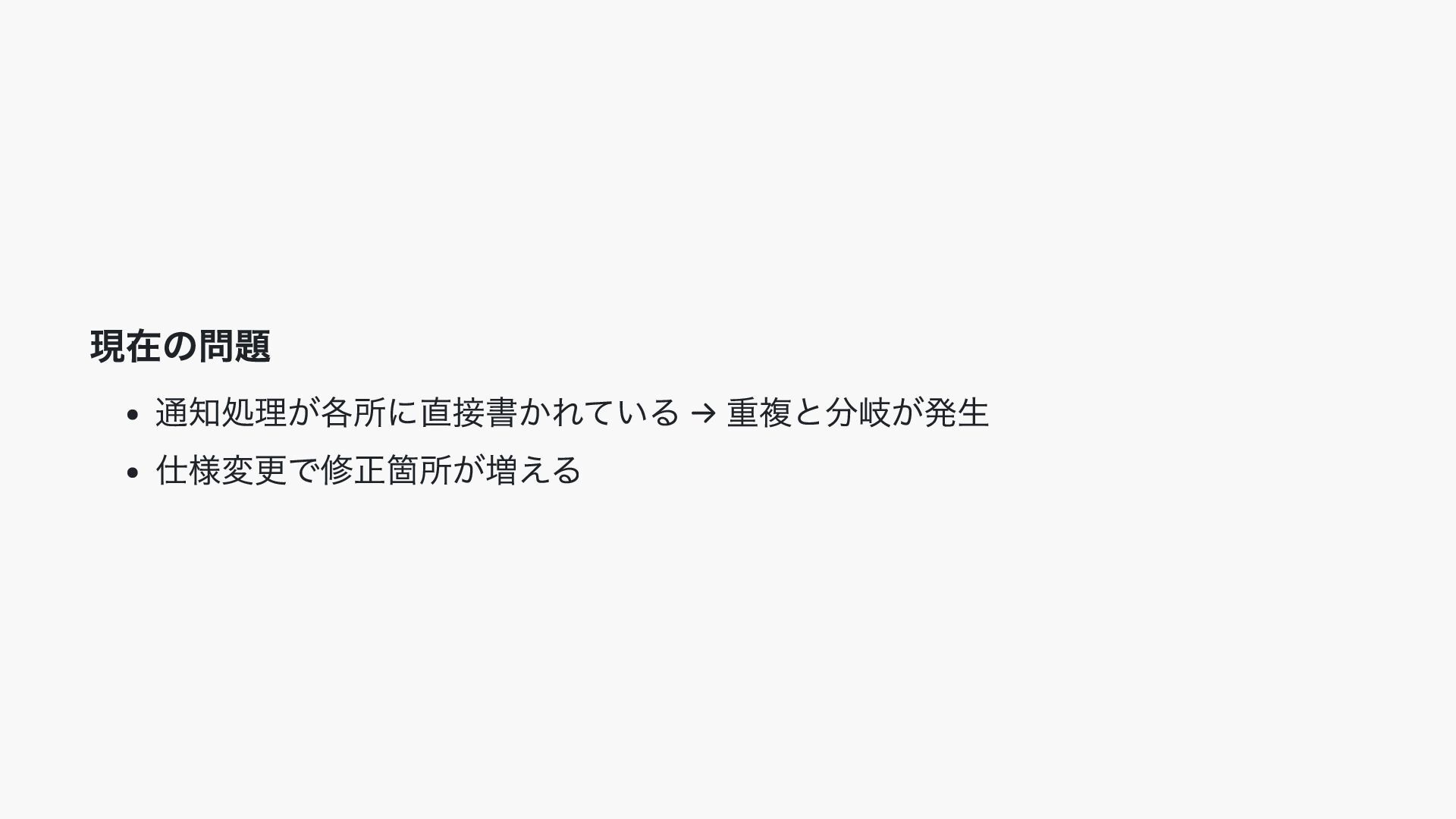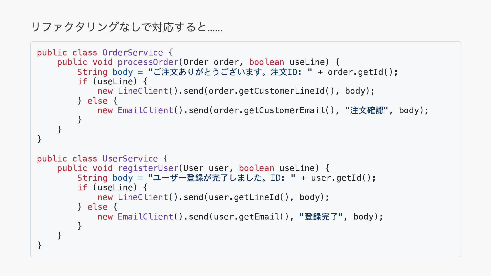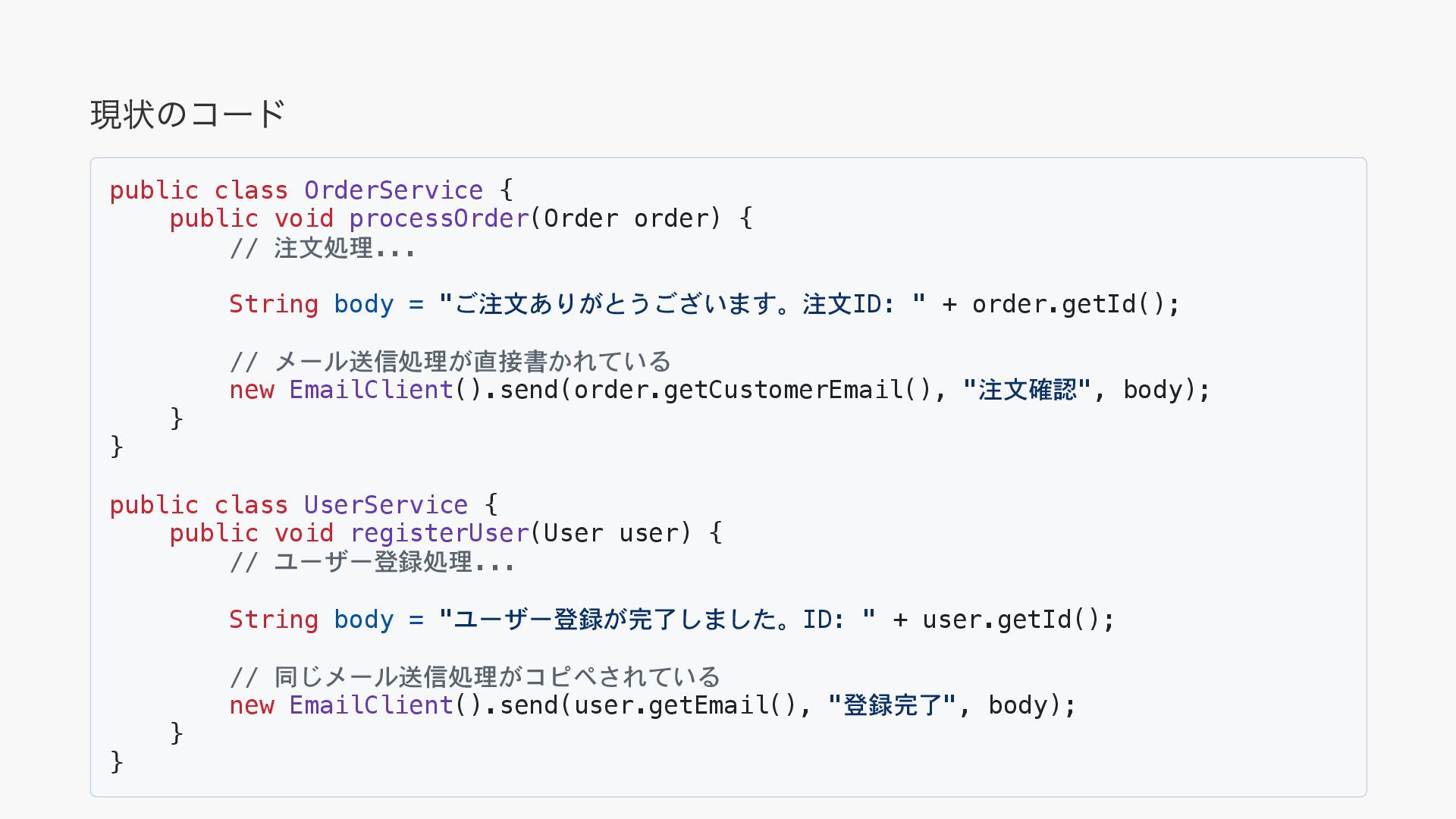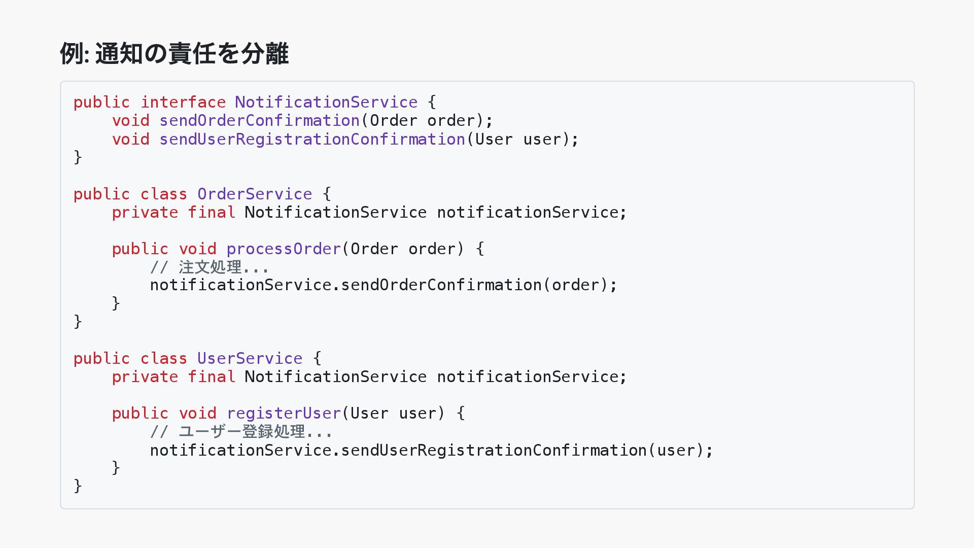 sendUserRegistrationConfirmation(User user); } public class OrderService { private final NotificationService notificationService; public void processOrder(Order order) { // 注文処理... notificationService.sendOrderConfirmation(order); } } public class UserService { private final NotificationService notificationService; public void registerUser(User user) { // ユーザー登録処理... notificationService.sendUserRegistrationConfirmation(user); } }