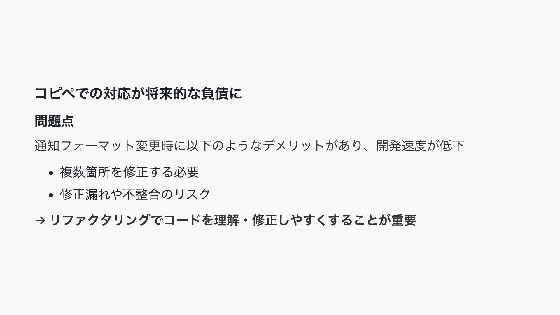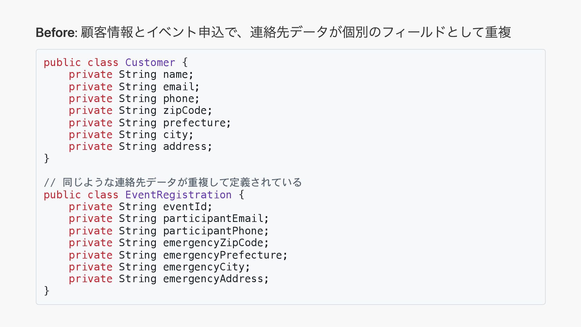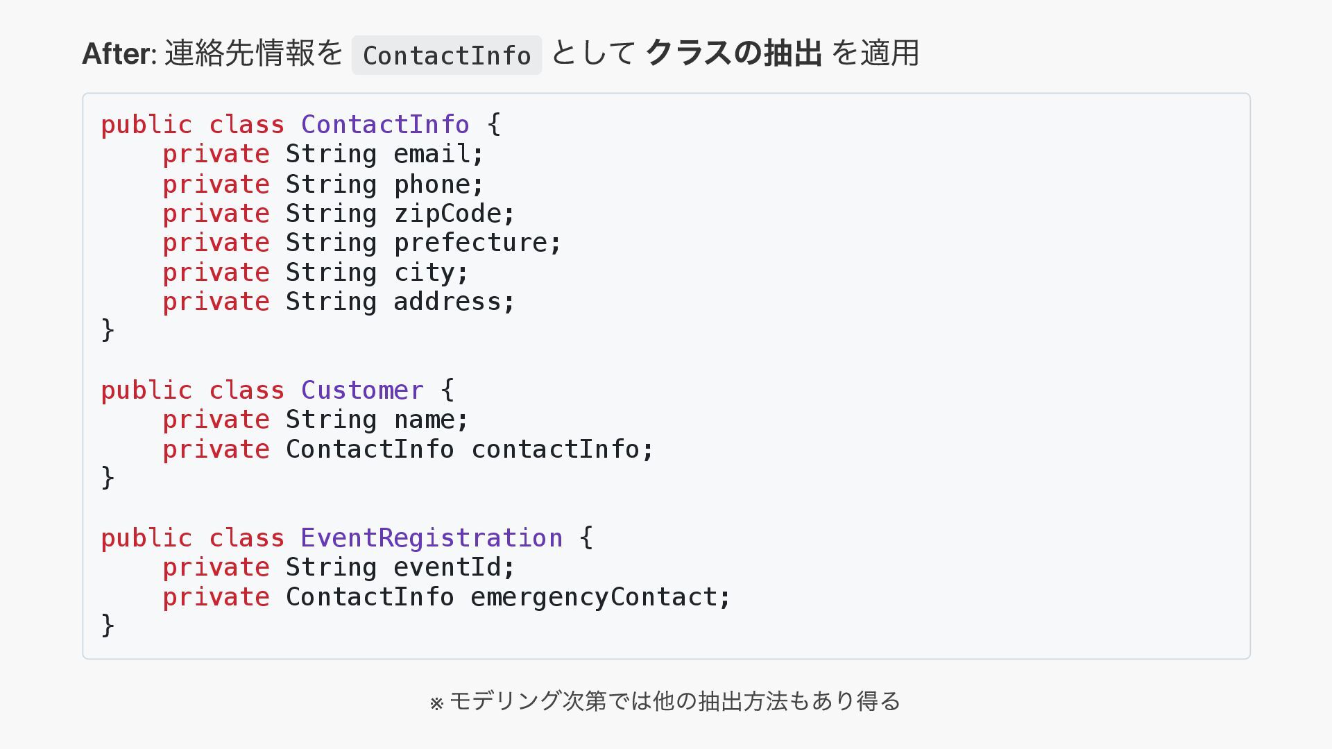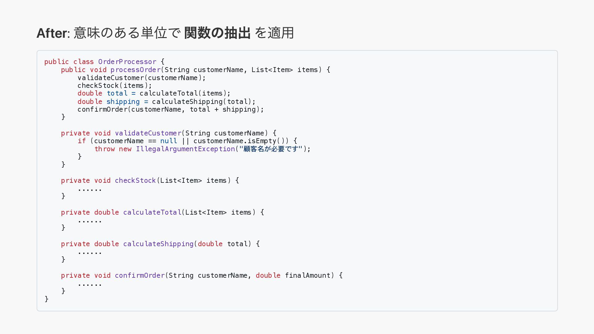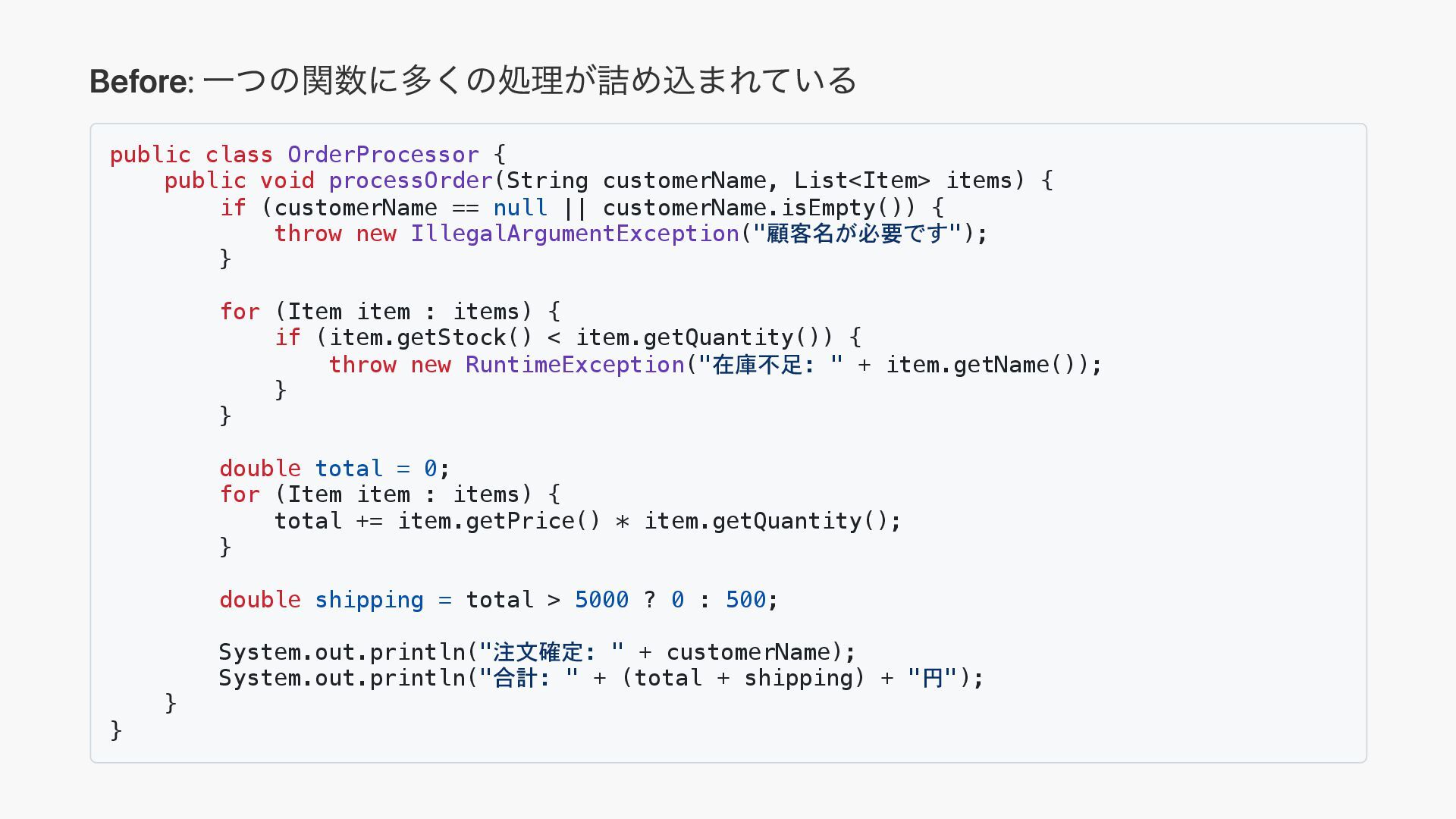 sendUserRegistrationConfirmation(User user); } public class OrderService { private final NotificationService notificationService; public void processOrder(Order order) { // 注文処理... notificationService.sendOrderConfirmation(order); } } public class UserService { private final NotificationService notificationService; public void registerUser(User user) { // ユーザー登録処理... notificationService.sendUserRegistrationConfirmation(user); } }