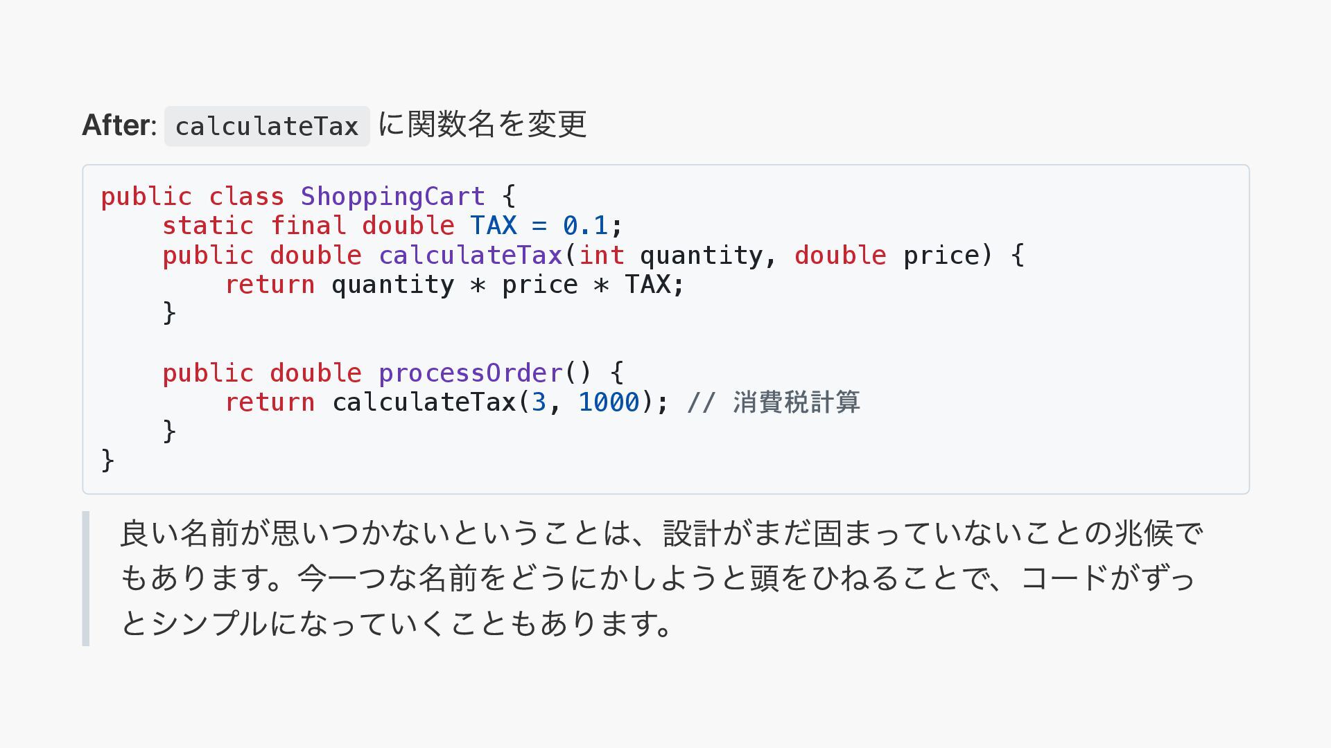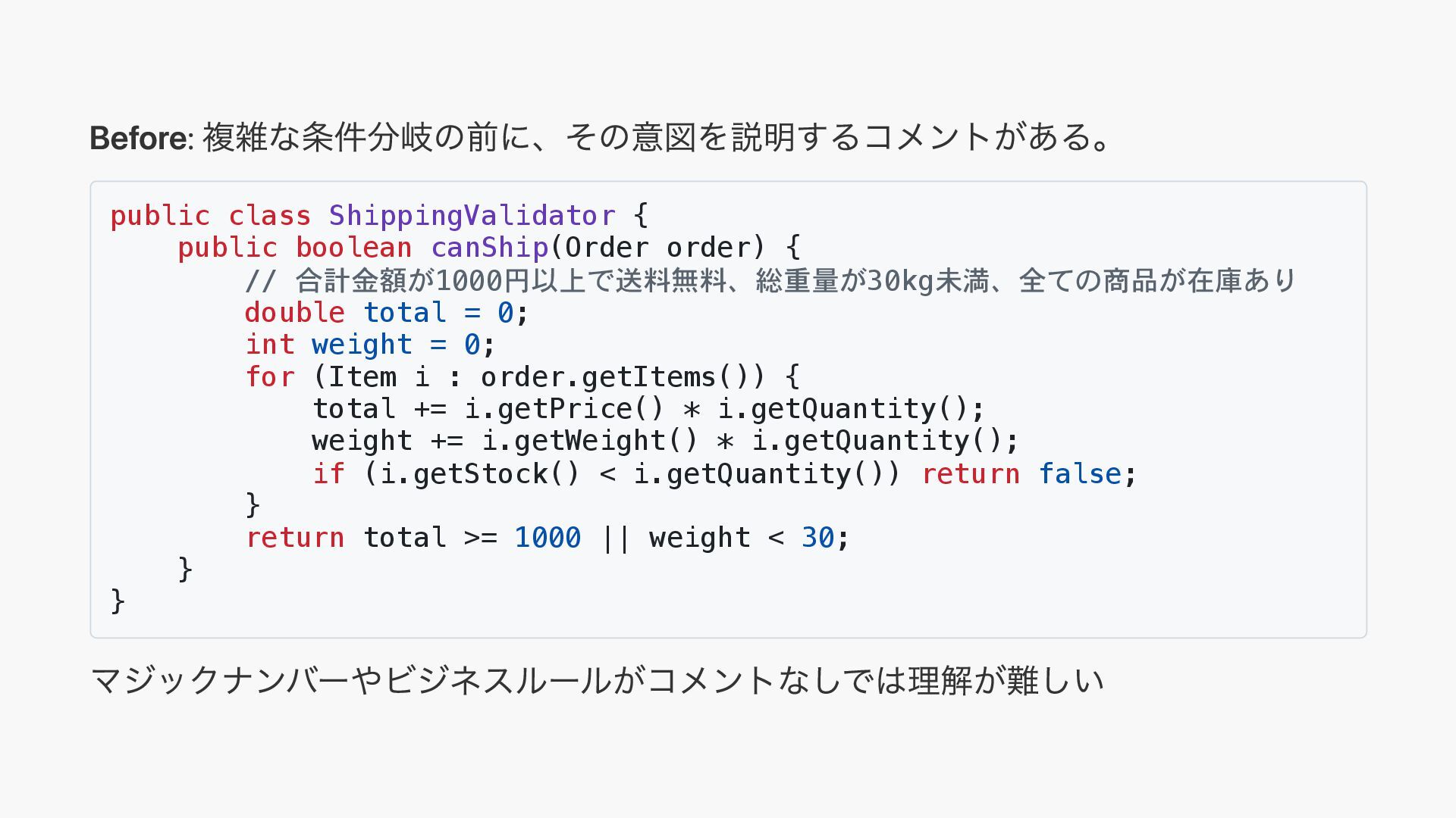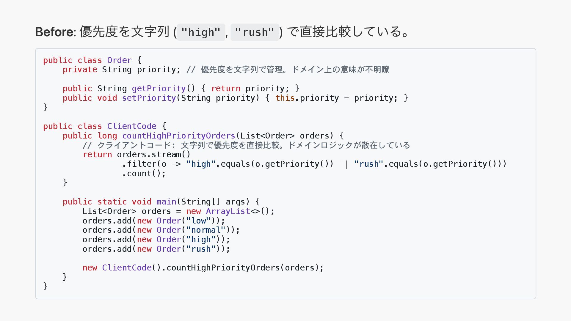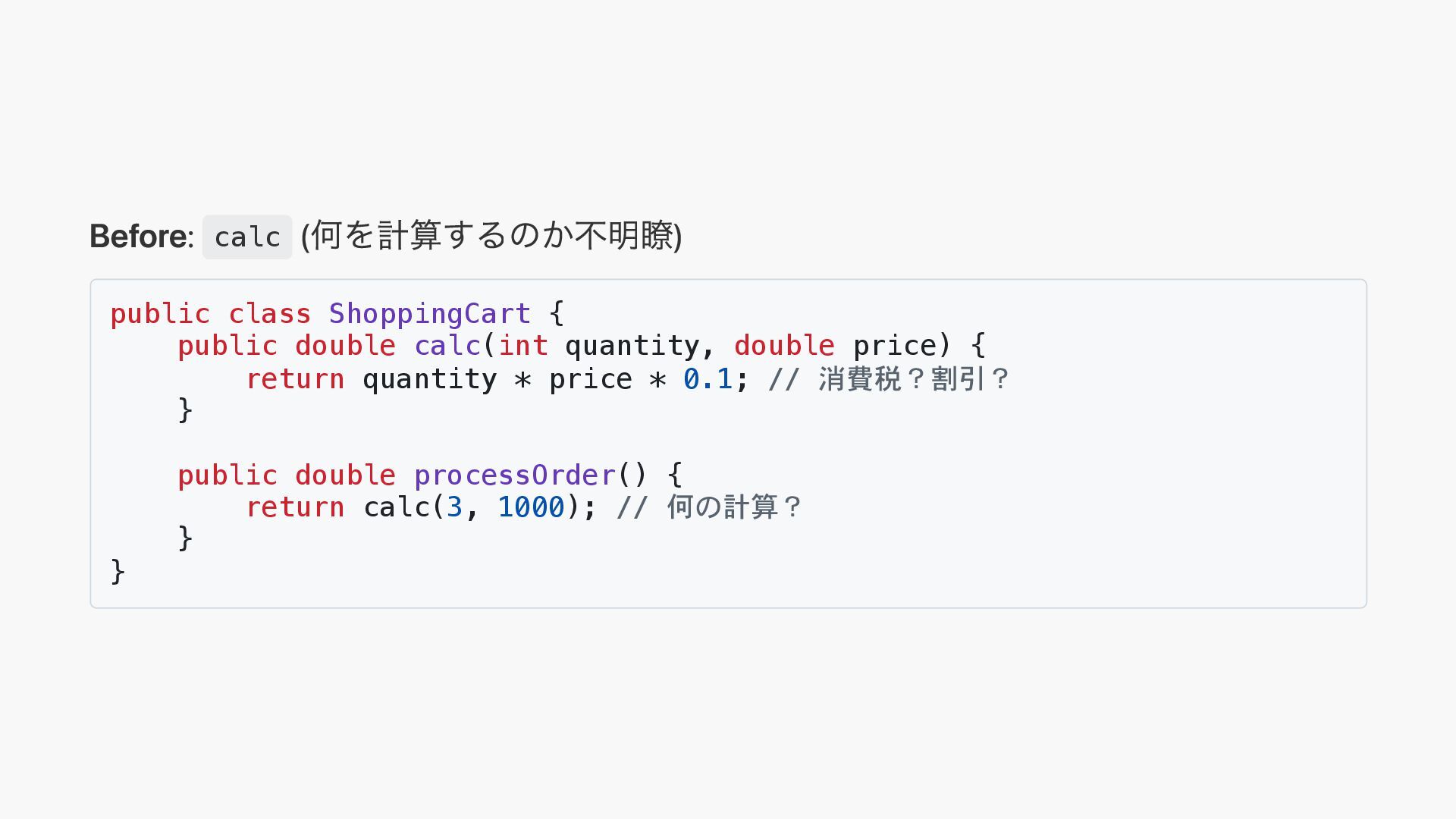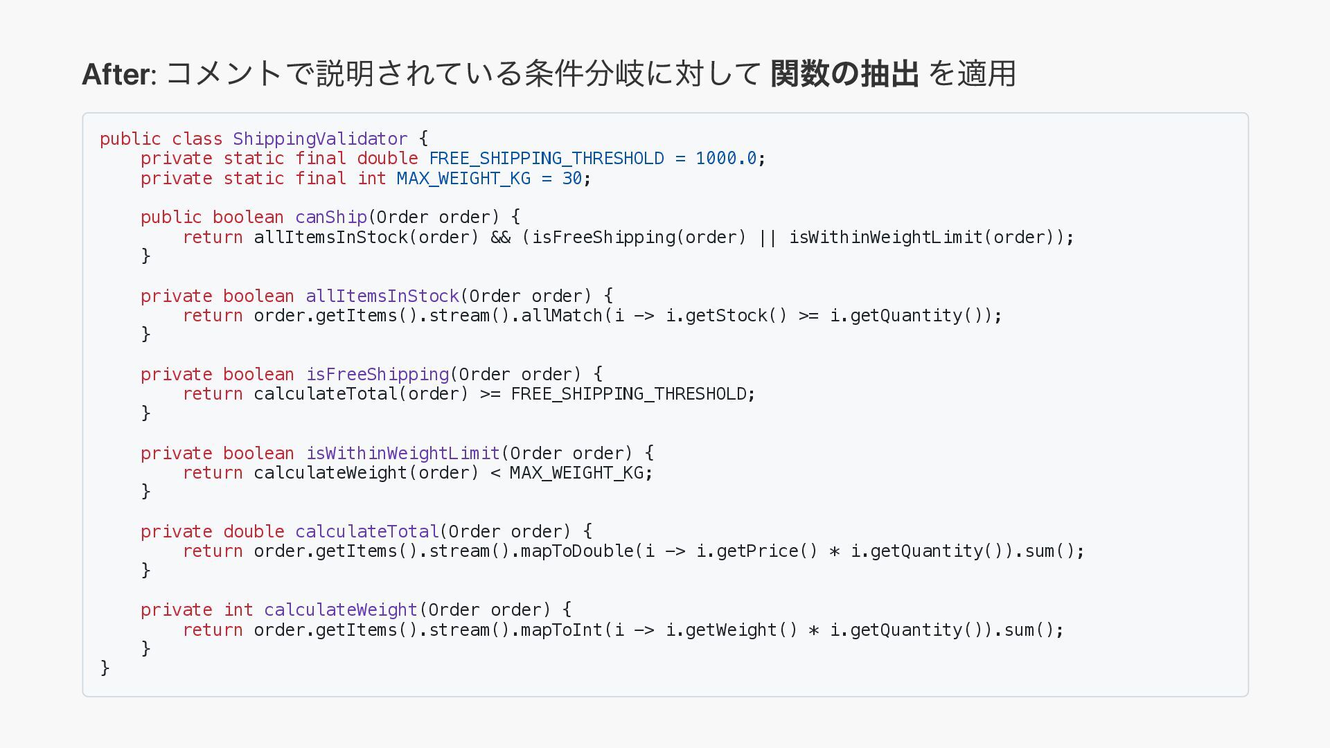 sendUserRegistrationConfirmation(User user); } public class OrderService { private final NotificationService notificationService; public void processOrder(Order order) { // 注文処理... notificationService.sendOrderConfirmation(order); } } public class UserService { private final NotificationService notificationService; public void registerUser(User user) { // ユーザー登録処理... notificationService.sendUserRegistrationConfirmation(user); } }