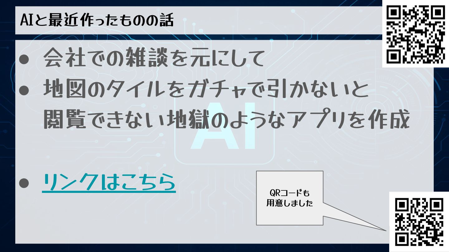 AIと最近作ったものの話 • 会社での雑談を元にして • 地図のタイルをガチャで引かないと 閲覧できない地獄のようなアプリを作成 • リンクはこちら QRコードも