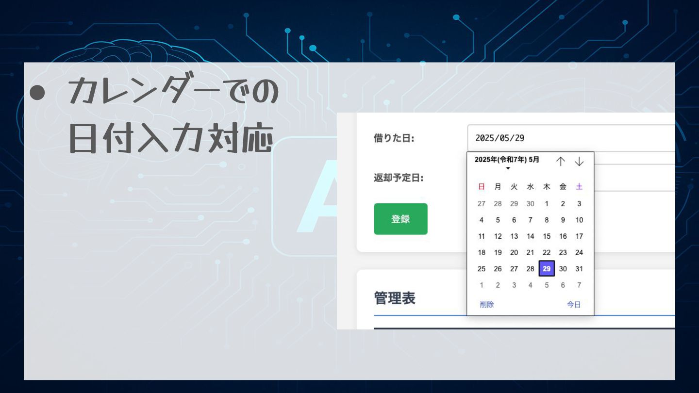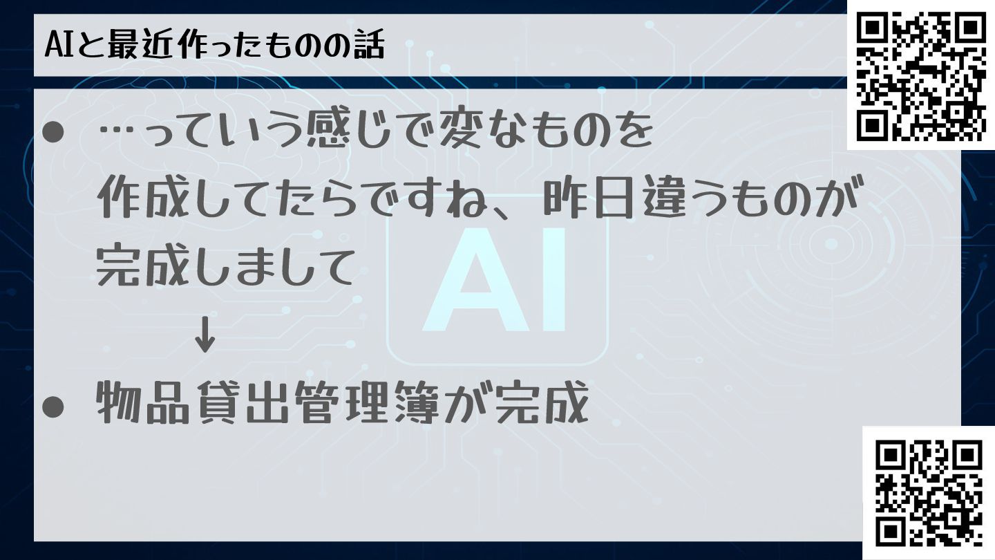 AIと最近作ったものの話 • …っていう感じで変なものを 作成してたらですね、昨日違うものが 完成しまして ↓ • 物品貸出管理簿が完成
