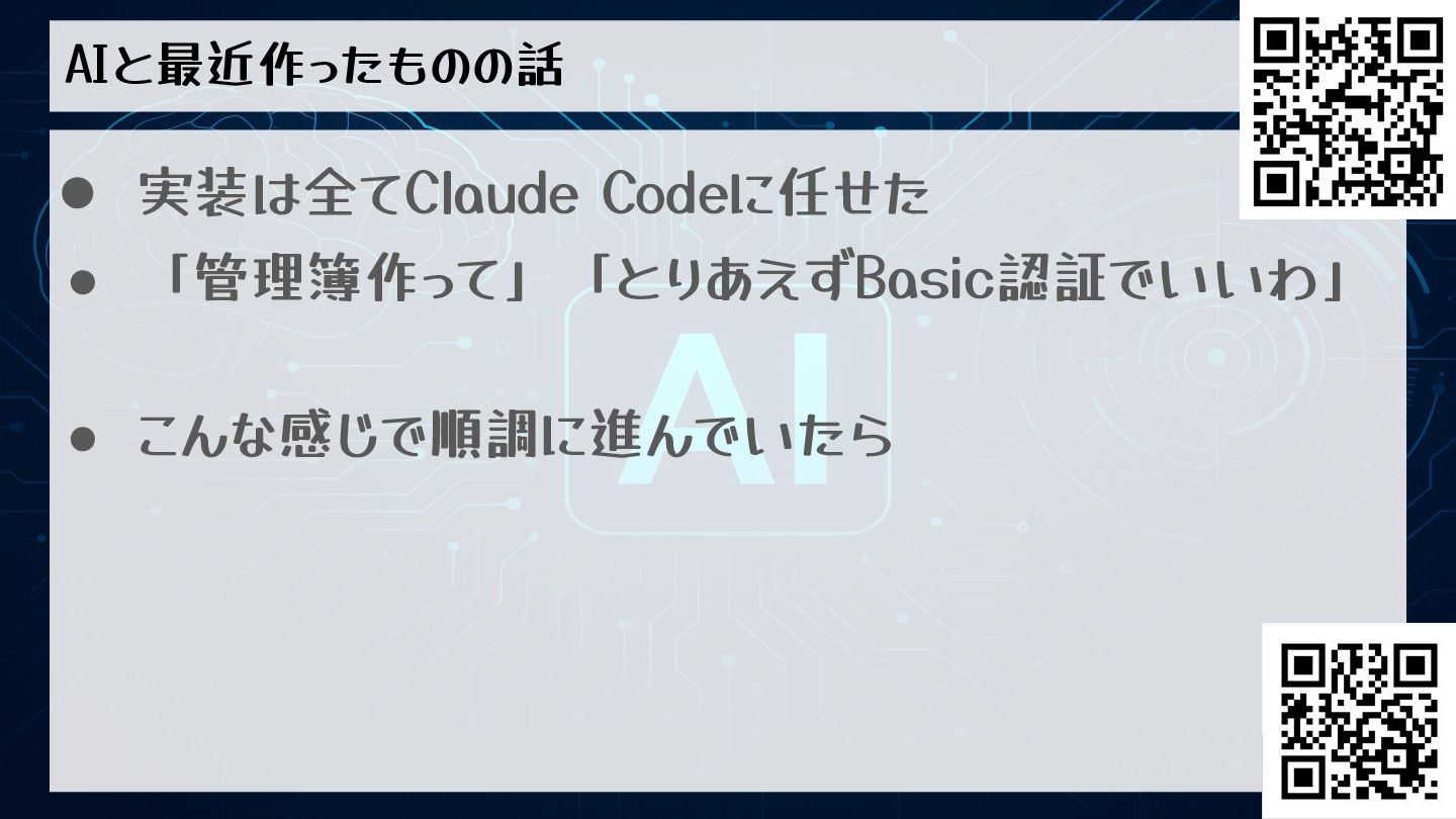 AIと最近作ったものの話 • 実装は全てClaude Codeに任せた • 「管理簿作って」「とりあえずBasic認証でいいわ」 • こんな感じで順調に進んでいたら