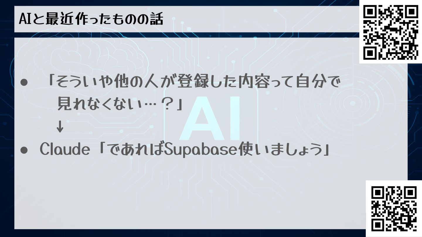 AIと最近作ったものの話 • 「そういや他の人が登録した内容って自分で 見れなくない…?」 ↓ • Claude「であればSupabase使いましょう」