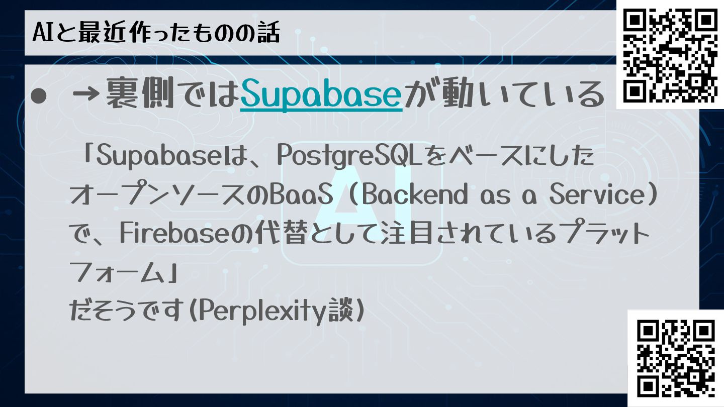 AIと最近作ったものの話 • →裏側ではSupabaseが動いている 「Supabaseは、PostgreSQLをベースにした オープンソースのBaaS(Backend as a Service) で、Firebaseの代替として注目されているプラット