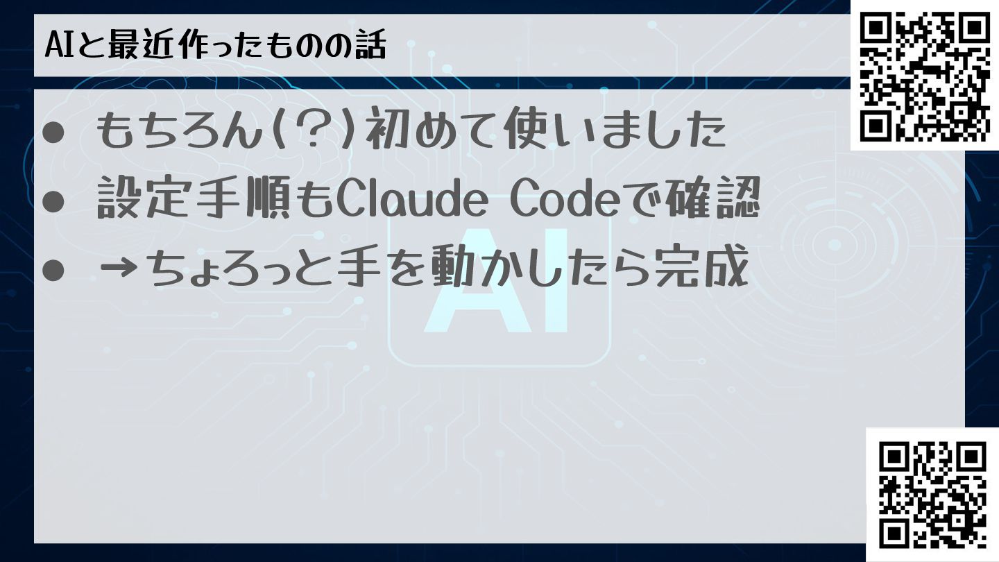 AIと最近作ったものの話 • もちろん(?)初めて使いました • 設定手順もClaude Codeで確認 • →ちょろっと手を動かしたら完成