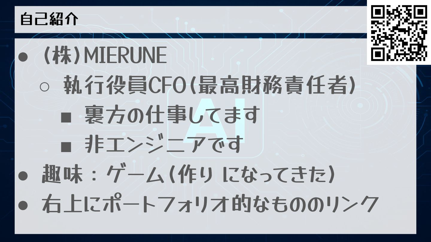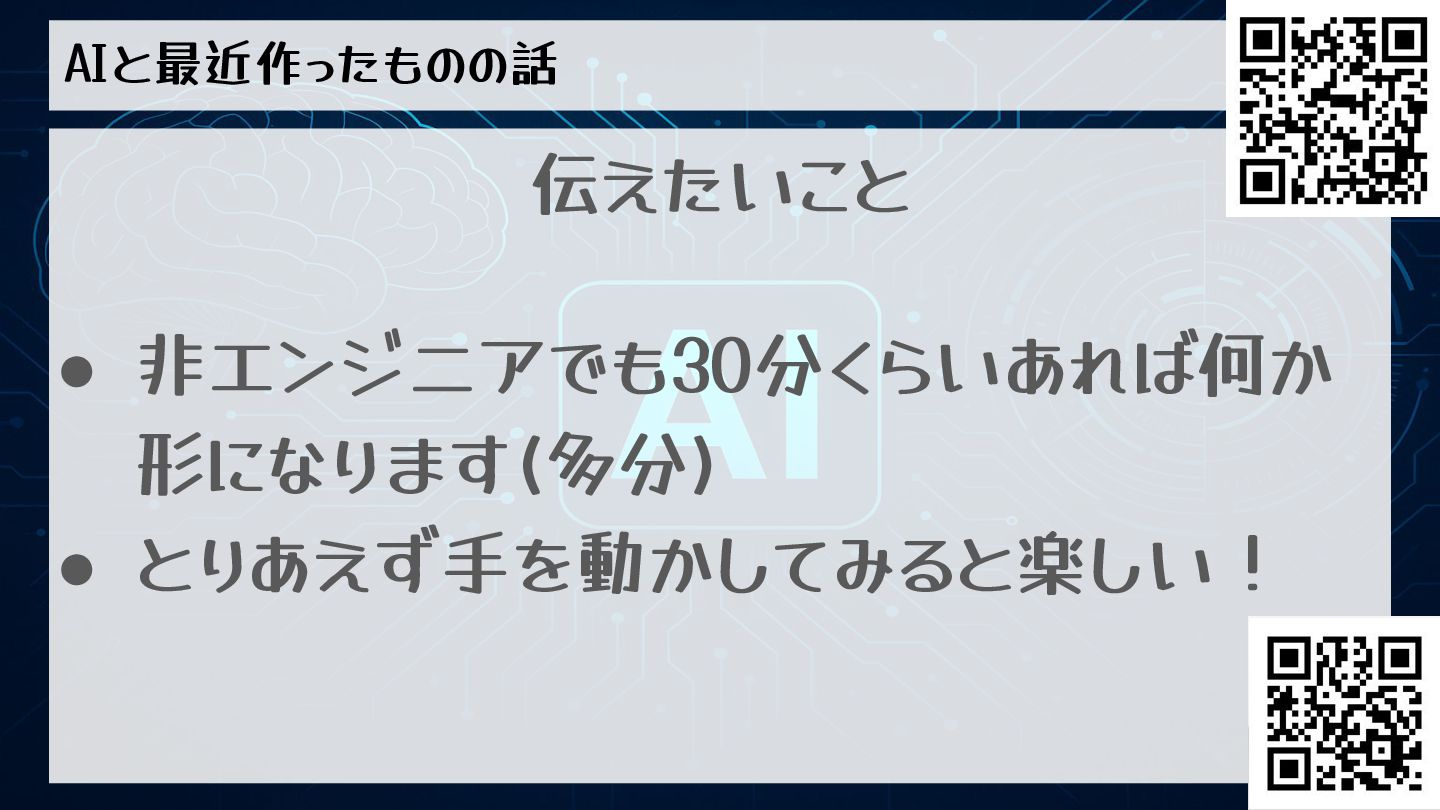 AIと最近作ったものの話 伝えたいこと • 非エンジニアでも30分くらいあれば何か 形になります(多分) • とりあえず手を動かしてみると楽しい!