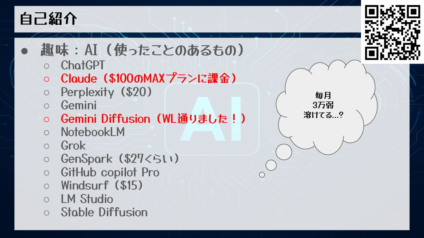 Gemini ◦ Gemini Diffusion(WL通りました!) ◦ NotebookLM ◦ Grok ◦ GenSpark($27くらい) ◦ GitHub copilot Pro ◦ Windsurf($15) ◦ LM Studio ◦ Stable Diffusion 毎月 3万弱 溶けてる...?