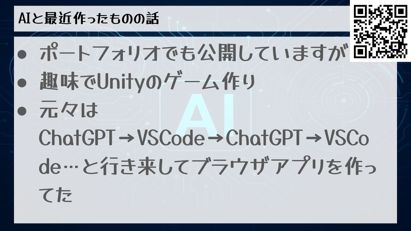 AIと最近作ったものの話 • ポートフォリオでも公開していますが • 趣味でUnityのゲーム作り • 元々は ChatGPT→VSCode→ChatGPT→VSCo de…と行き来してブラウザアプリを作っ てた