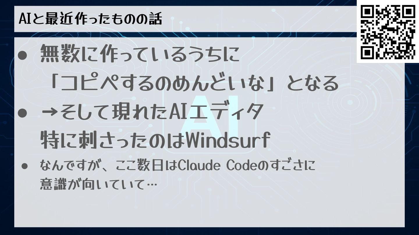 AIと最近作ったものの話 • 無数に作っているうちに 「コピペするのめんどいな」となる • →そして現れたAIエディタ 特に刺さったのはWindsurf • なんですが、ここ数日はClaude Codeのすごさに
