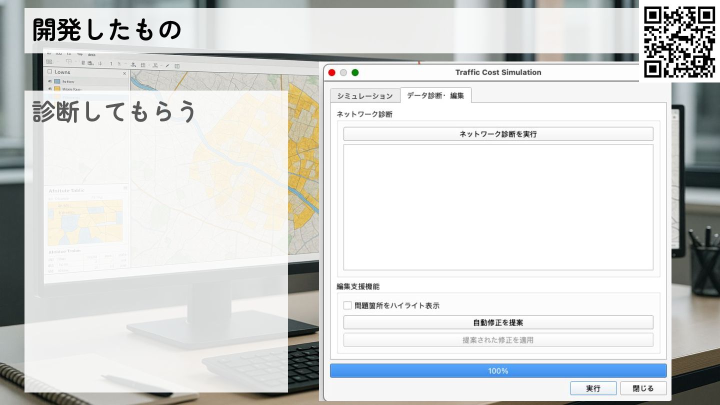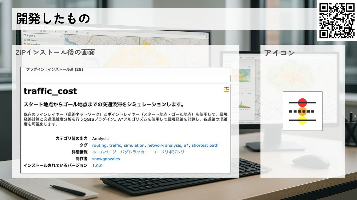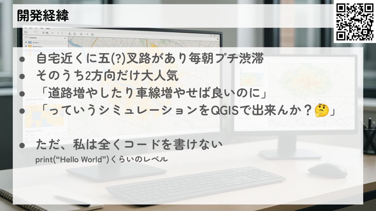 開発経緯 • 自宅近くに五(?)叉路があり毎朝プチ渋滞 • そのうち2方向だけ大人気 • 「道路増やしたり車線増やせば良いのに」 • 「っていうシミュレーションをQGISで出来んか?🤔」 •