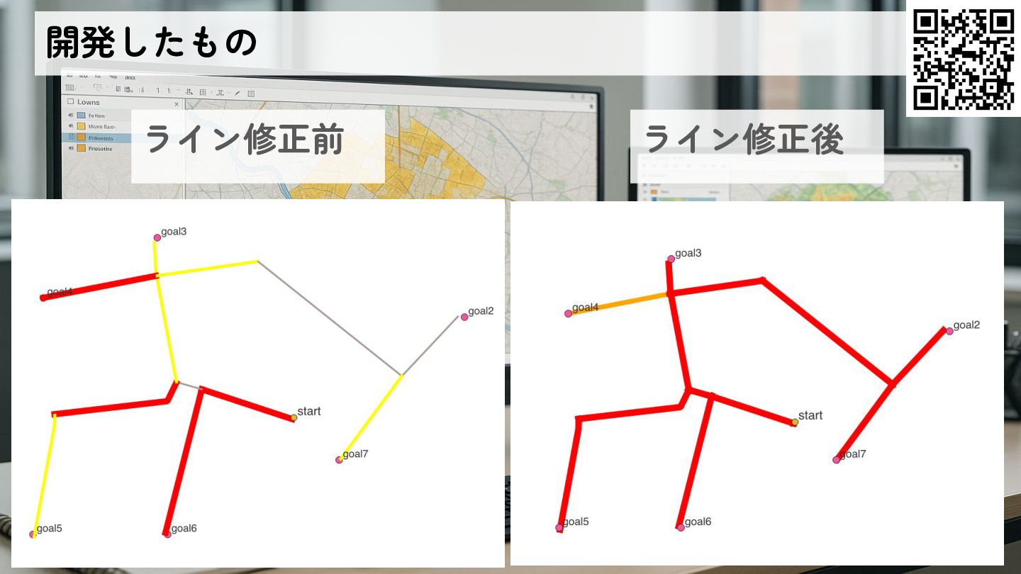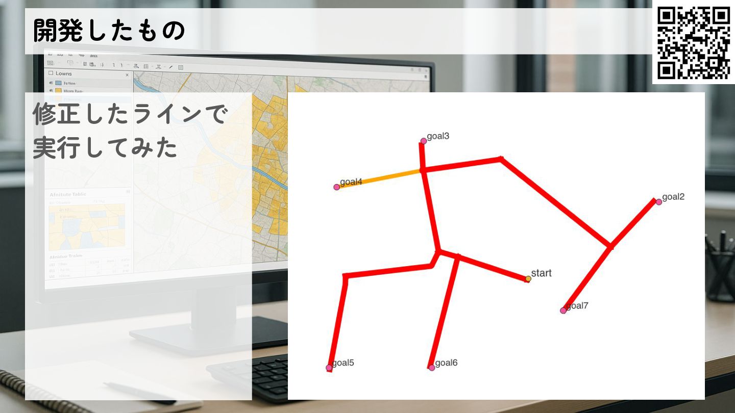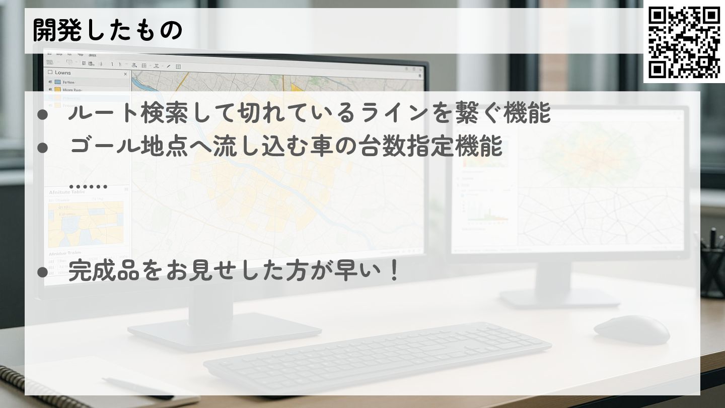 開発したもの • ルート検索して切れているラインを繋ぐ機能 • ゴール地点へ流し込む車の台数指定機能 …… • 完成品をお見せした方が早い!