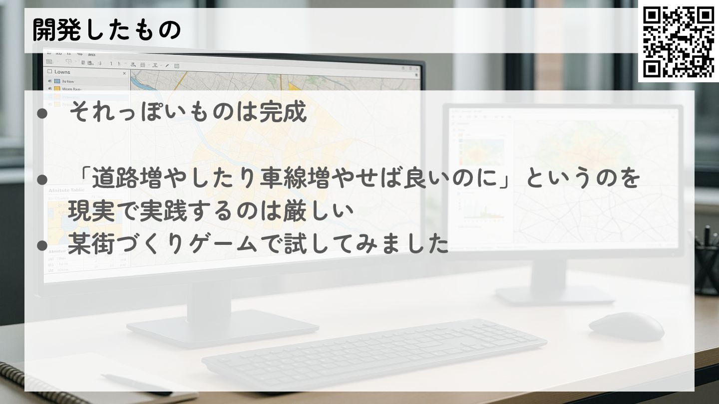 開発したもの • それっぽいものは完成 • 「道路増やしたり車線増やせば良いのに」というのを 現実で実践するのは厳しい • 某街づくりゲームで試してみました