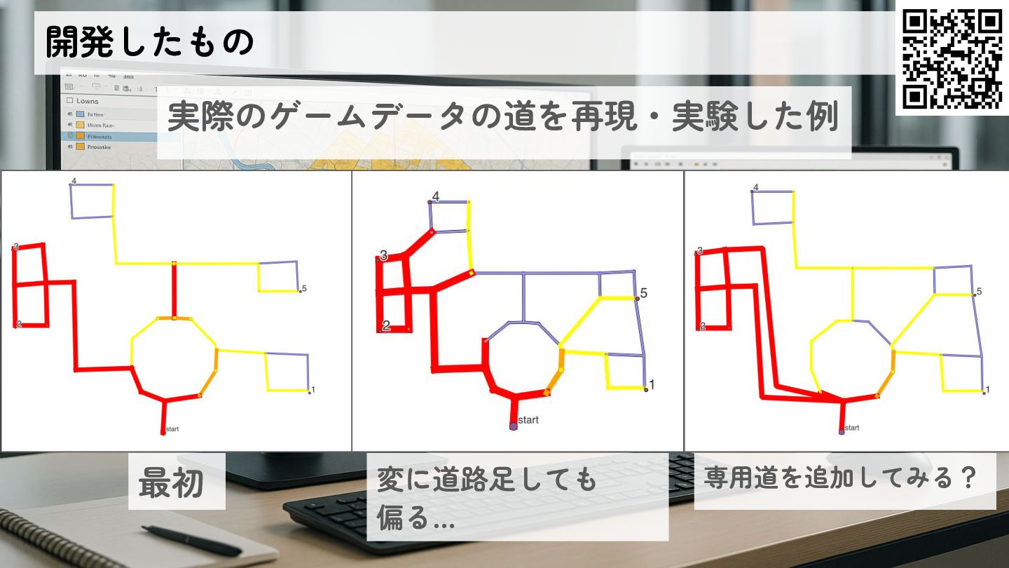 開発したもの 実際のゲームデータの道を再現・実験した例 最初 変に道路足しても 偏る… 専用道を追加してみる?