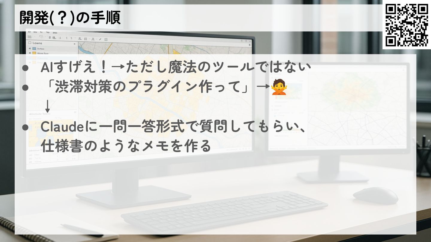 開発(?)の手順 • AIすげえ!→ただし魔法のツールではない • 「渋滞対策のプラグイン作って」→🙅 ↓ • Claudeに一問一答形式で質問してもらい、 仕様書のようなメモを作る
