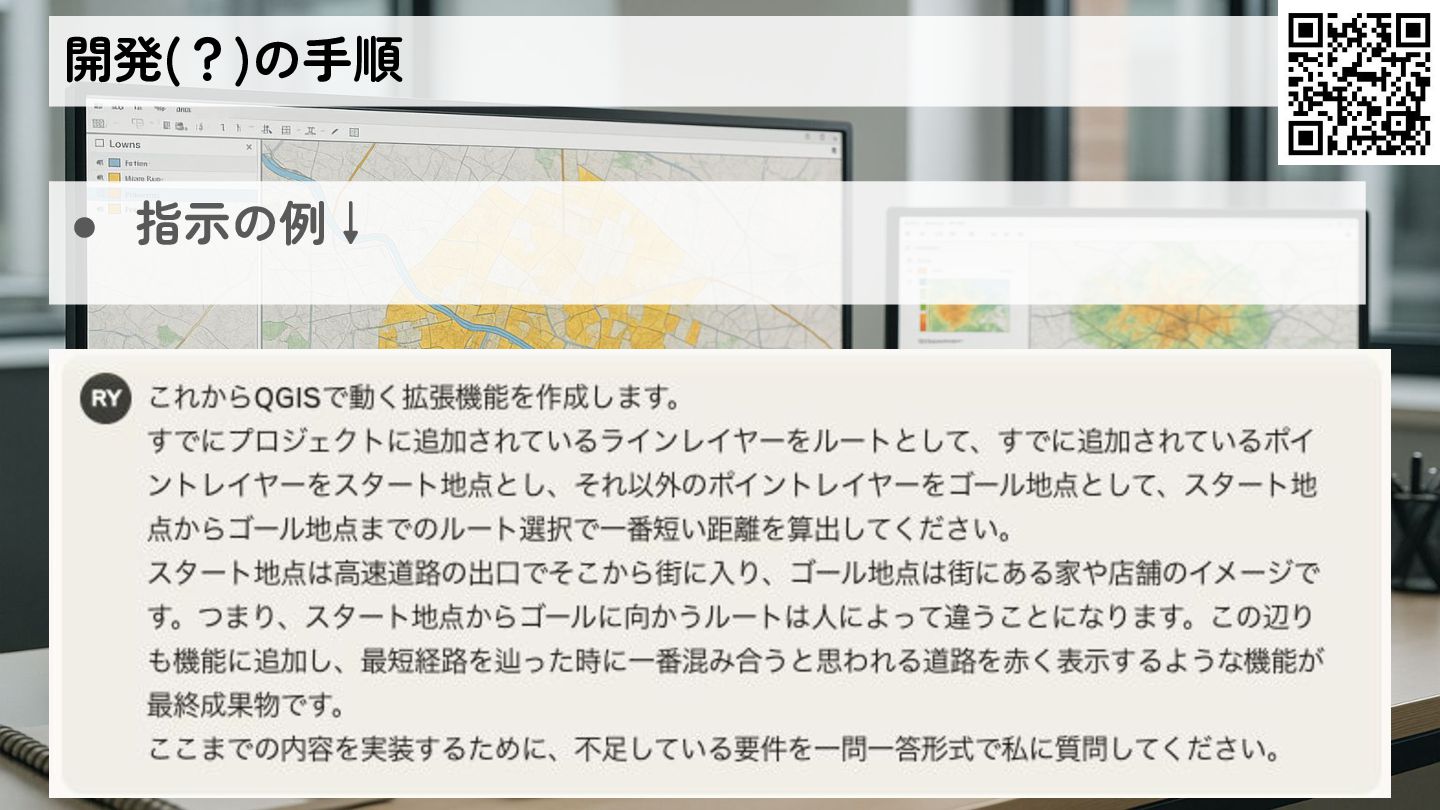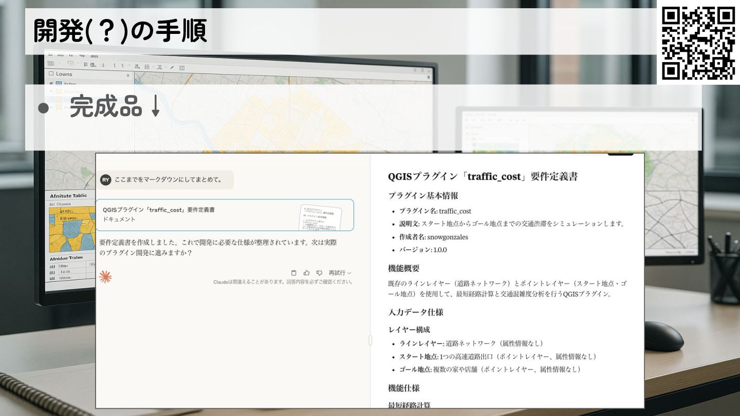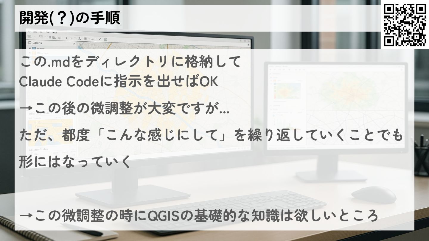 開発(?)の手順 この.mdをディレクトリに格納して Claude Codeに指示を出せばOK →この後の微調整が大変ですが... ただ、都度「こんな感じにして」を繰り返していくことでも 形にはなっていく →この微調整の時にQGISの基礎的な知識は欲しいところ