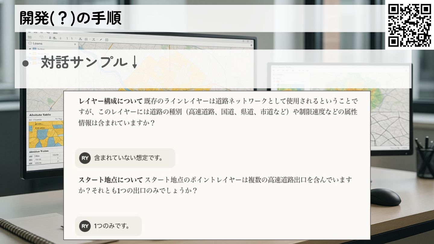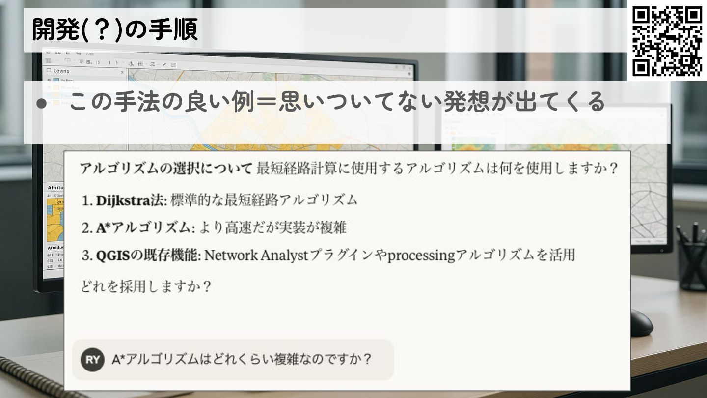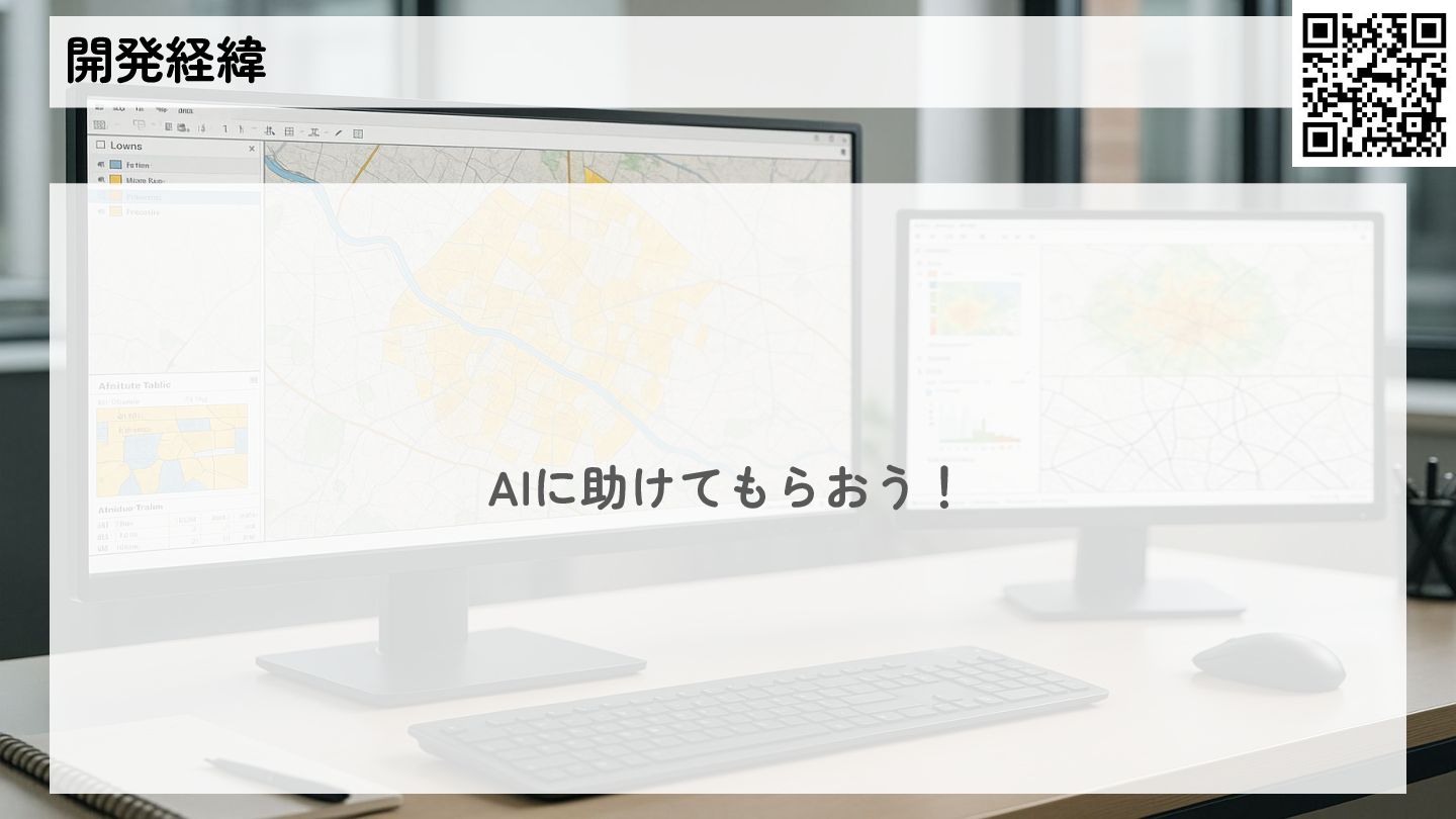 開発(?)の手順 この.mdをディレクトリに格納して Claude Codeに指示を出せばOK →この後の微調整が大変ですが... ただ、都度「こんな感じにして」を繰り返していくことでも 形にはなっていく →この微調整の時にQGISの基礎的な知識は欲しいところ