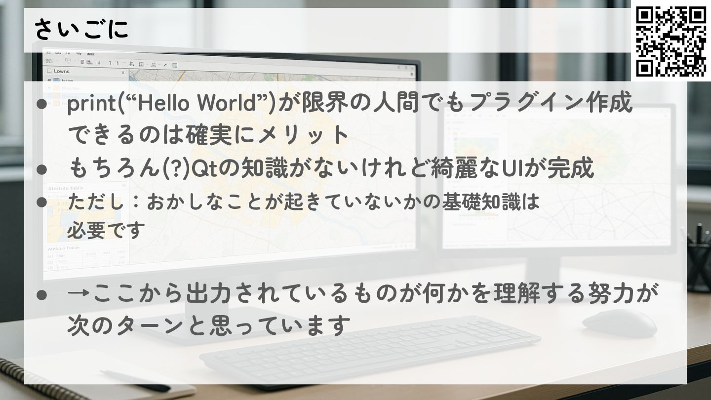さいごに • print(“Hello World”)が限界の人間でもプラグイン作成 できるのは確実にメリット • もちろん(?)Qtの知識がないけれど綺麗なUIが完成 • ただし:おかしなことが起きていないかの基礎知識は 必要です
