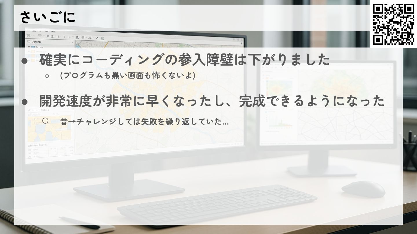 さいごに • 確実にコーディングの参入障壁は下がりました ◦ (プログラムも黒い画面も怖くないよ) • 開発速度が非常に早くなったし、完成できるようになった ◦ 昔→チャレンジしては失敗を繰り返していた…