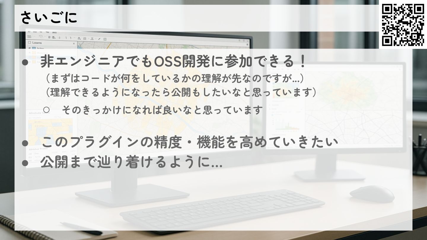 さいごに • 非エンジニアでもOSS開発に参加できる! (まずはコードが何をしているかの理解が先なのですが...) (理解できるようになったら公開もしたいなと思っています) ◦ そのきっかけになれば良いなと思っています • このプラグインの精度・機能を高めていきたい •