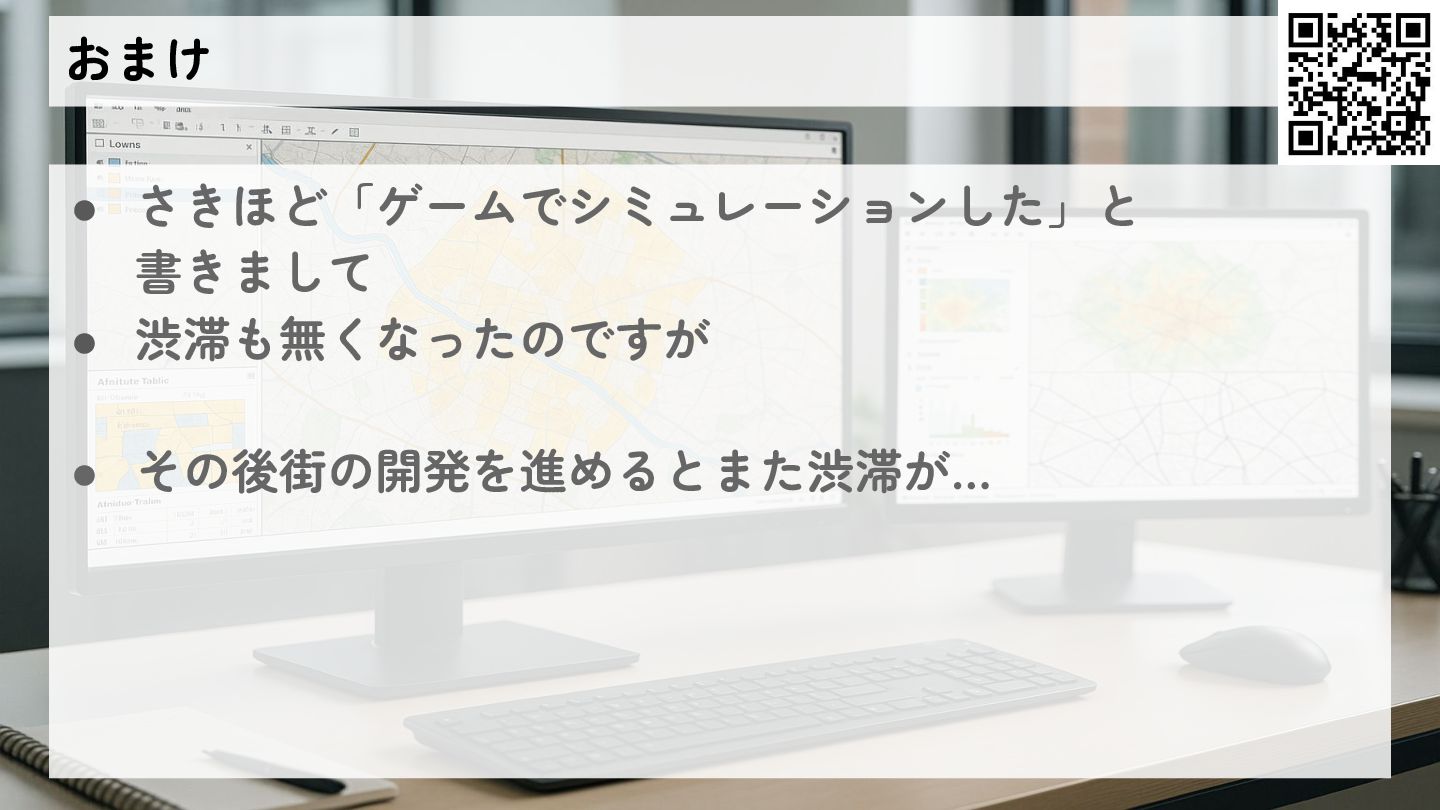 おまけ • さきほど「ゲームでシミュレーションした」と 書きまして • 渋滞も無くなったのですが • その後街の開発を進めるとまた渋滞が…