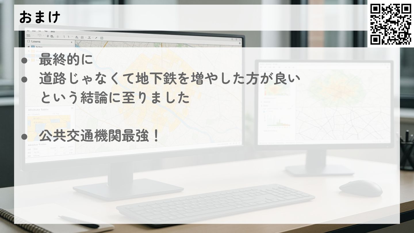 おまけ • 最終的に • 道路じゃなくて地下鉄を増やした方が良い という結論に至りました • 公共交通機関最強!