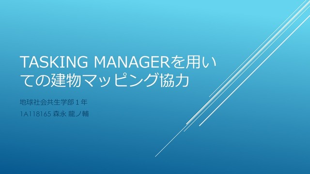 TASKING MANAGERを用い ての建物マッピング協力 地球社会共生学部1年 1A118165 森永 龍ノ輔