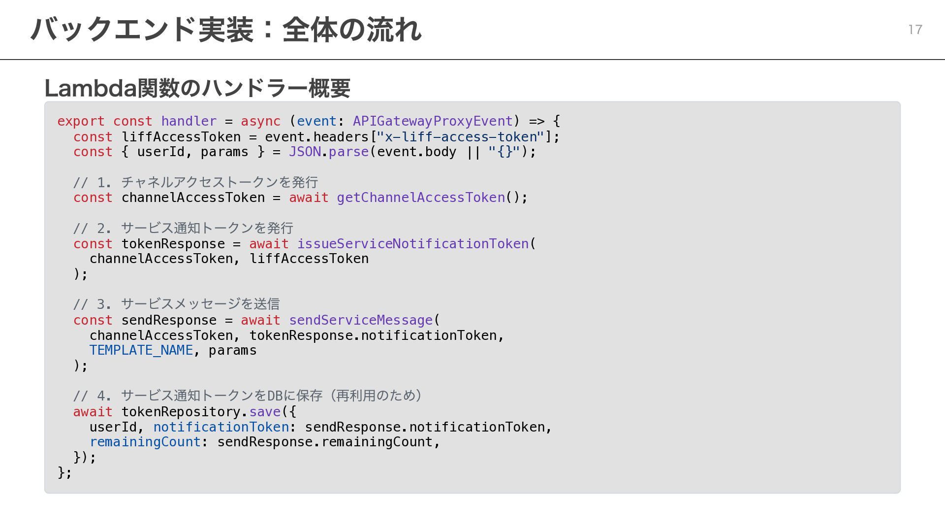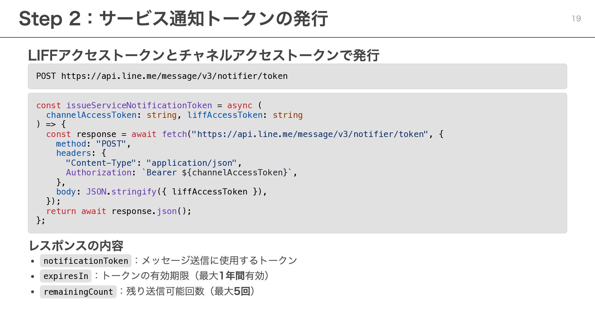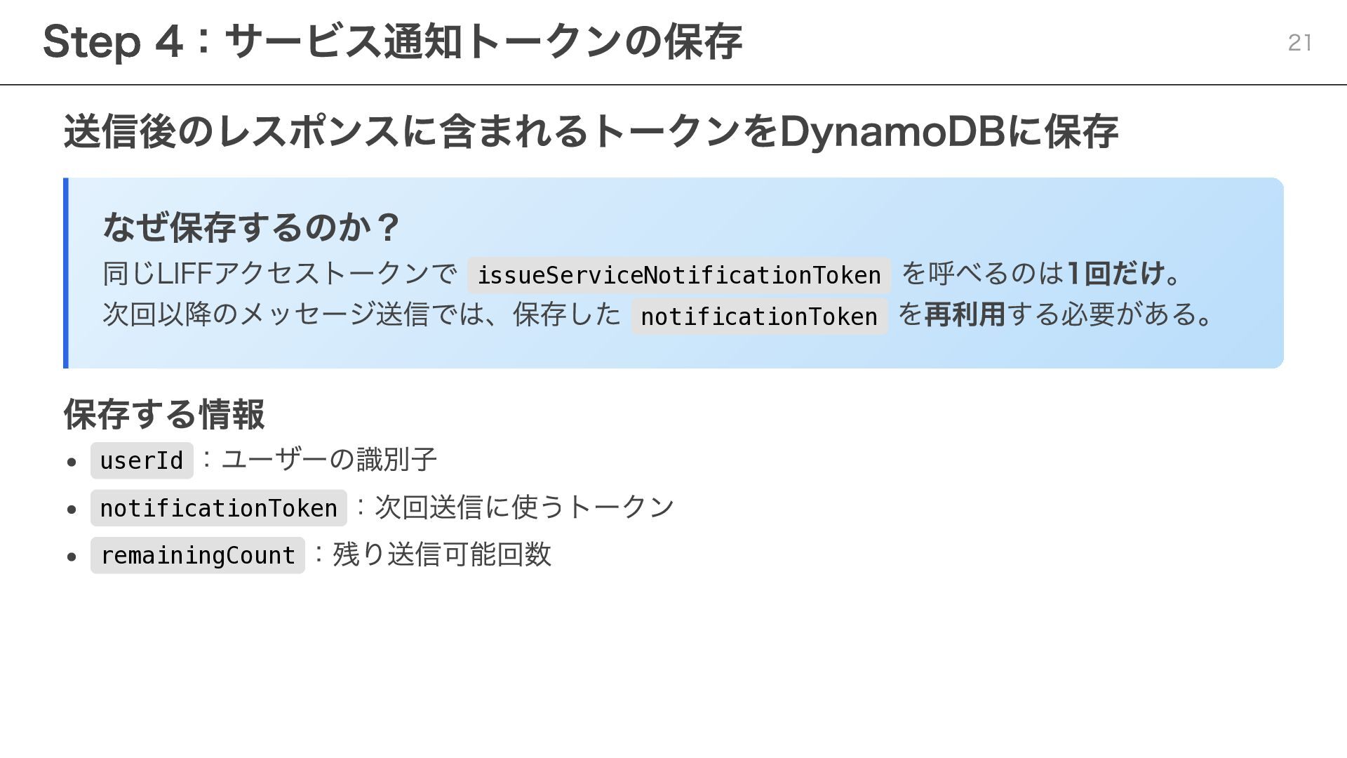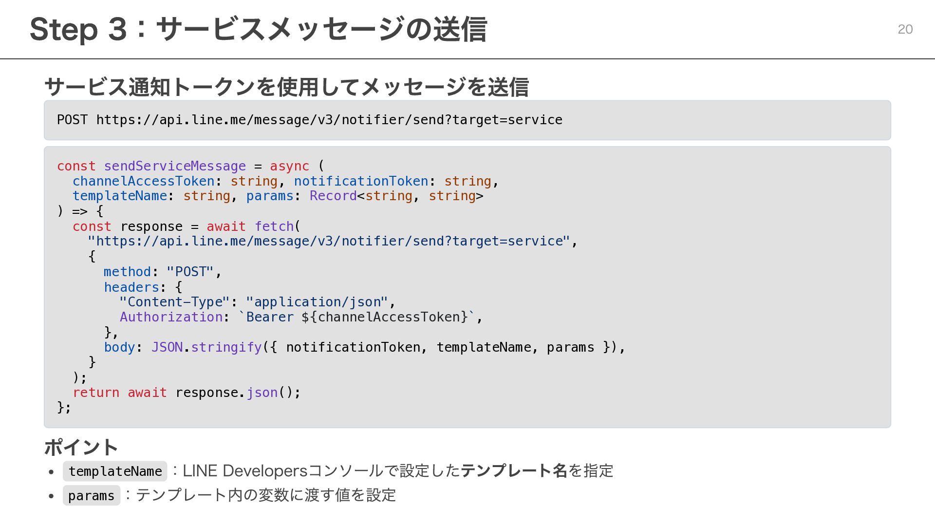 notificationToken: string, templateName: string, params: Record<string, string> ) => { const response = await fetch( "https://api.line.me/message/v3/notifier/send?target=service", { method: "POST", headers: { "Content-Type": "application/json", Authorization: `Bearer ${channelAccessToken}`, }, body: JSON.stringify({ notificationToken, templateName, params }), } ); return await response.json(); }; ポイント templateName :LINE Developersコンソールで設定したテンプレート名を指定 params :テンプレート内の変数に渡す値を設定 Step 3:サービスメッセージの送信 20