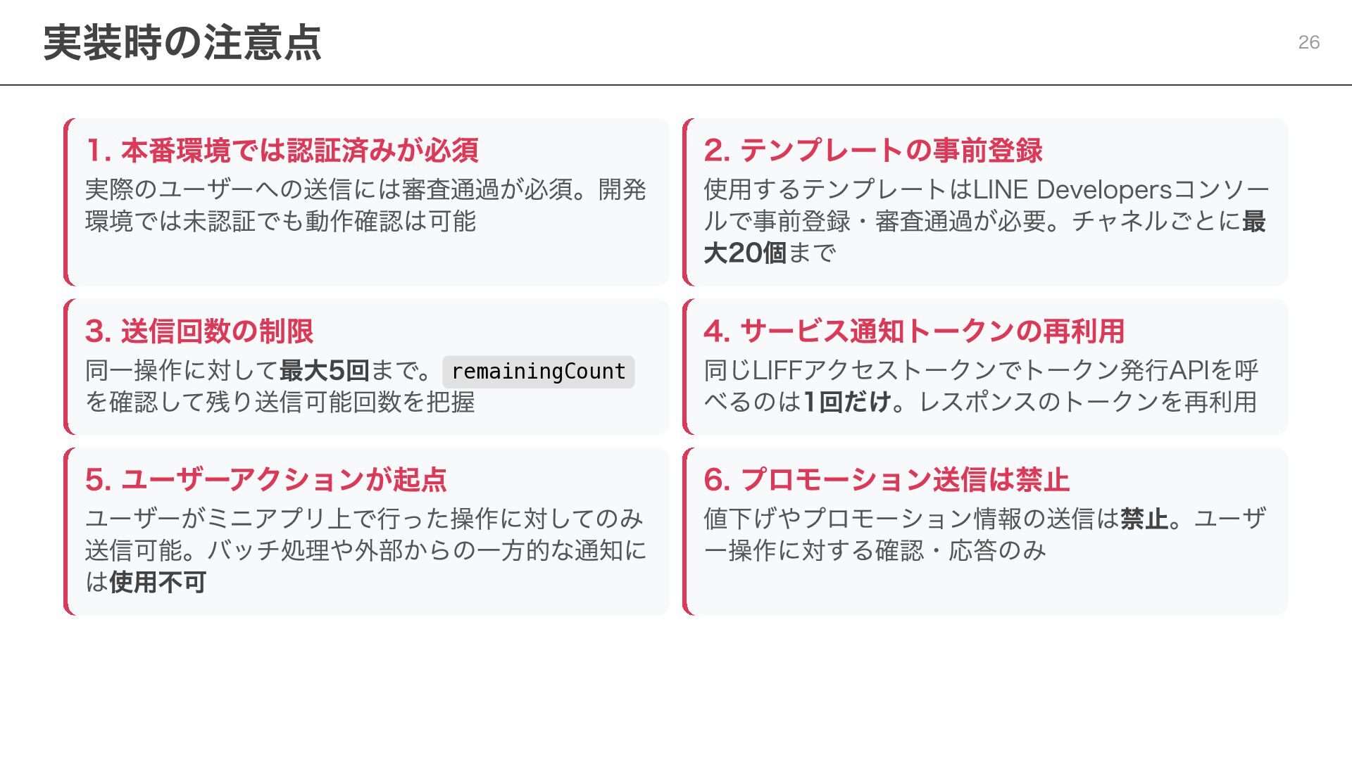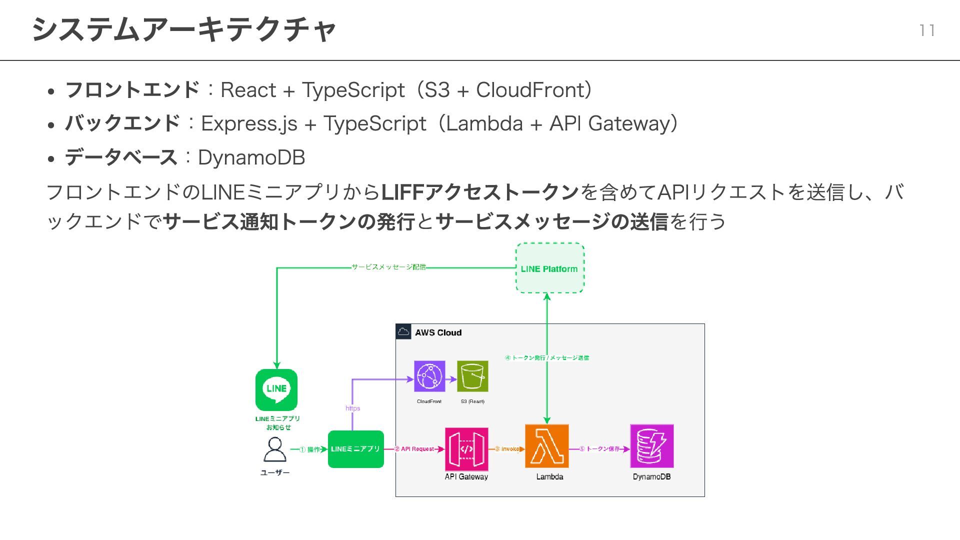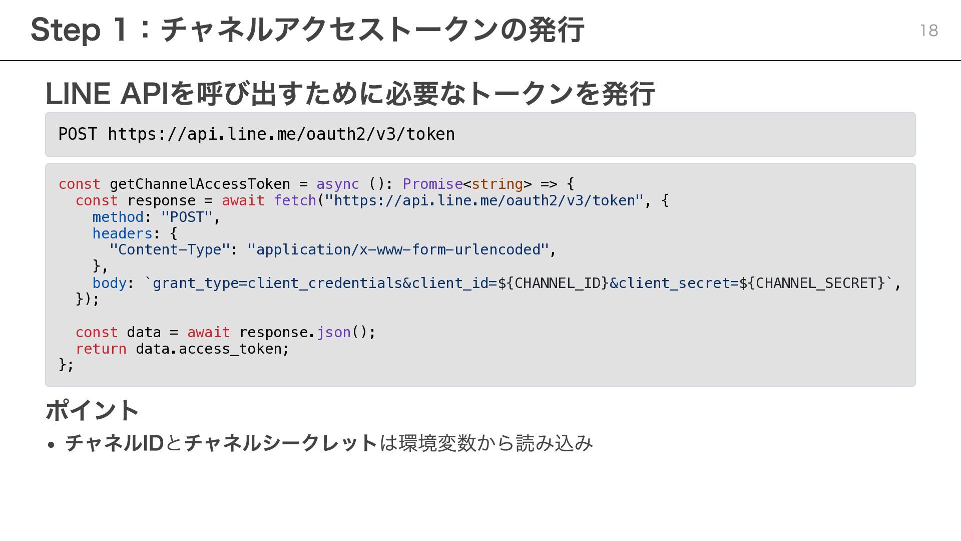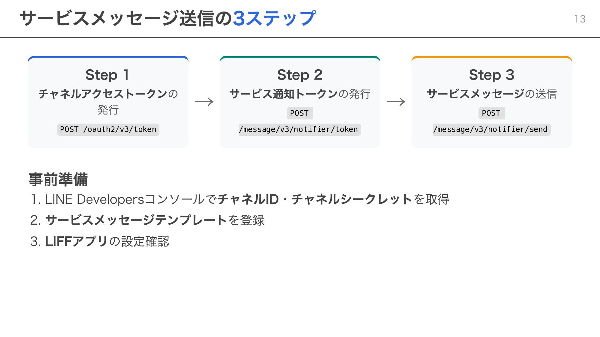 notificationToken: string, templateName: string, params: Record<string, string> ) => { const response = await fetch( "https://api.line.me/message/v3/notifier/send?target=service", { method: "POST", headers: { "Content-Type": "application/json", Authorization: `Bearer ${channelAccessToken}`, }, body: JSON.stringify({ notificationToken, templateName, params }), } ); return await response.json(); }; ポイント templateName :LINE Developersコンソールで設定したテンプレート名を指定 params :テンプレート内の変数に渡す値を設定 Step 3:サービスメッセージの送信 20