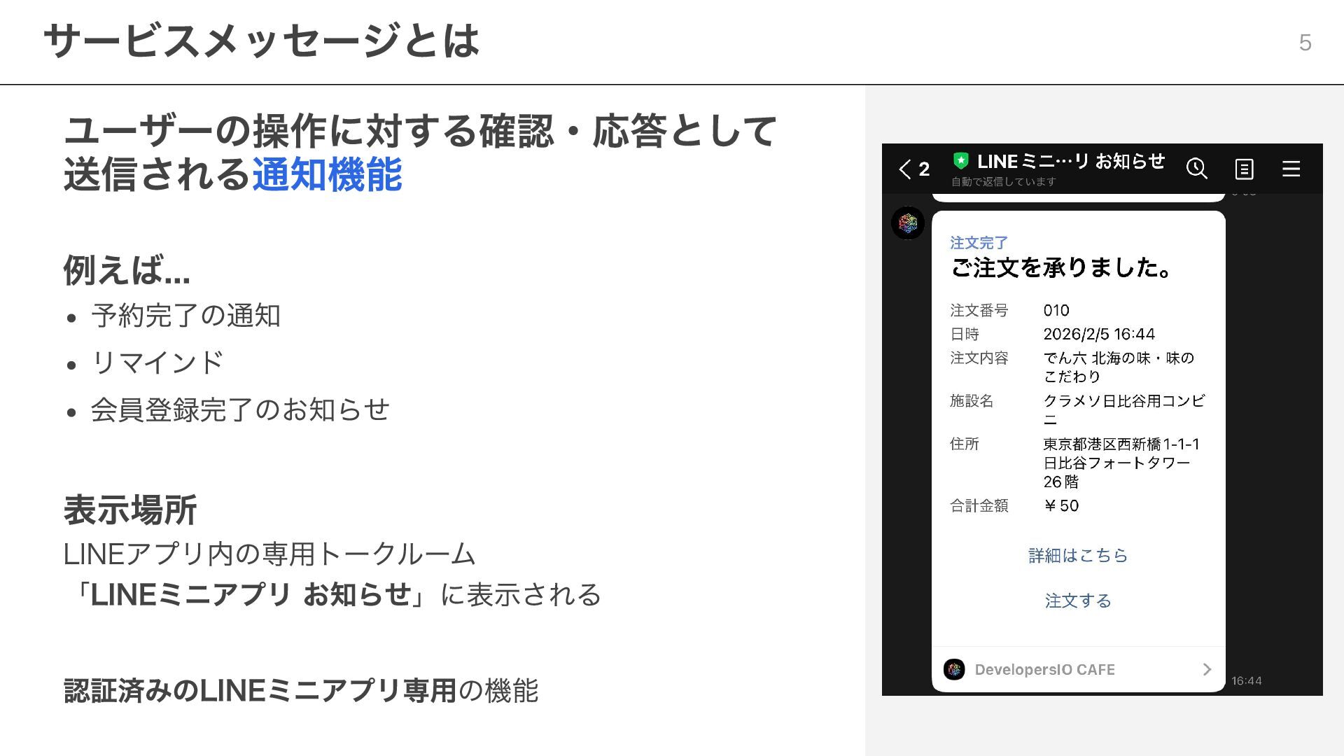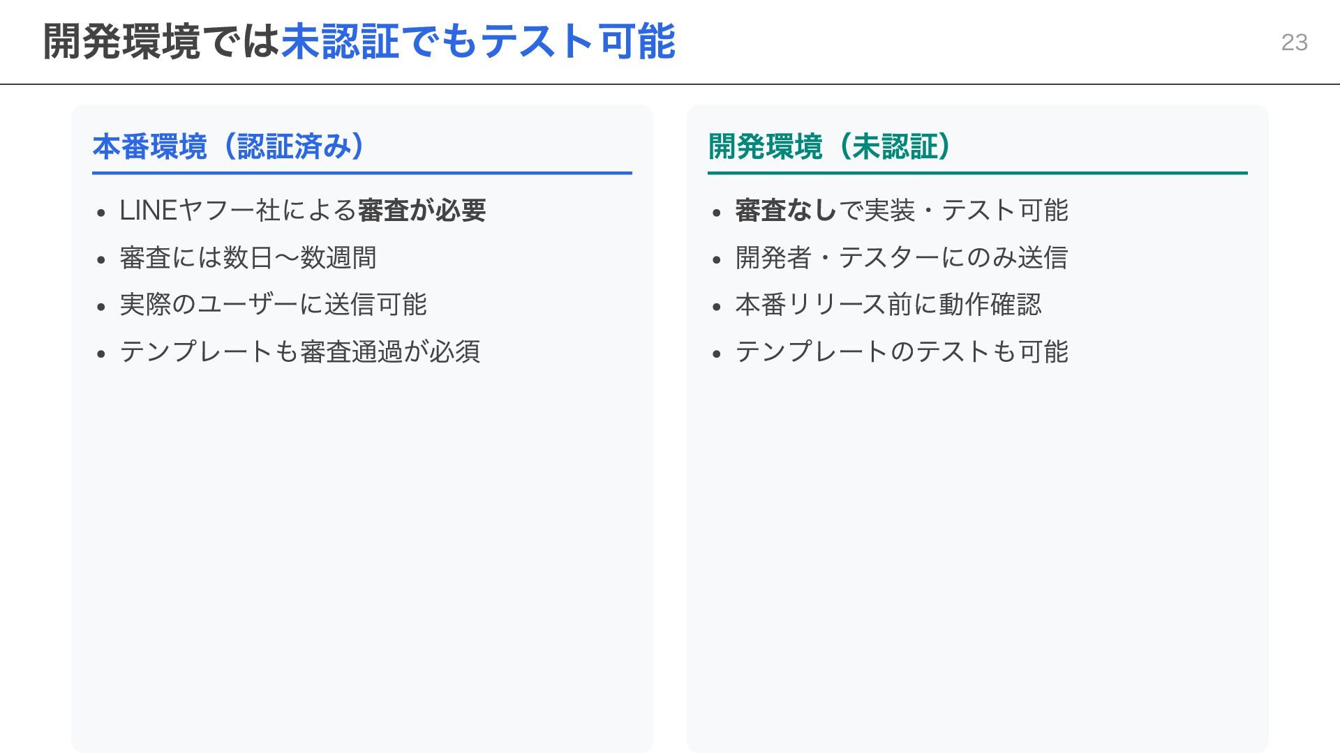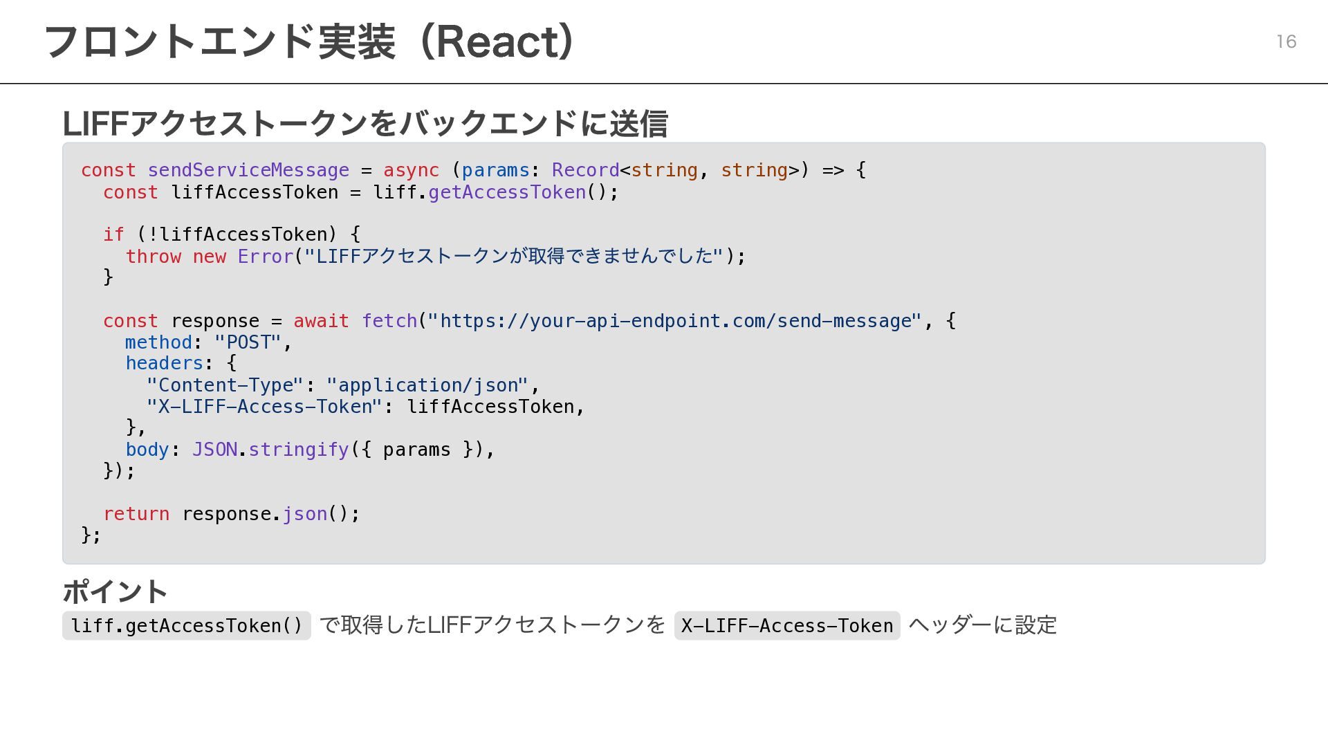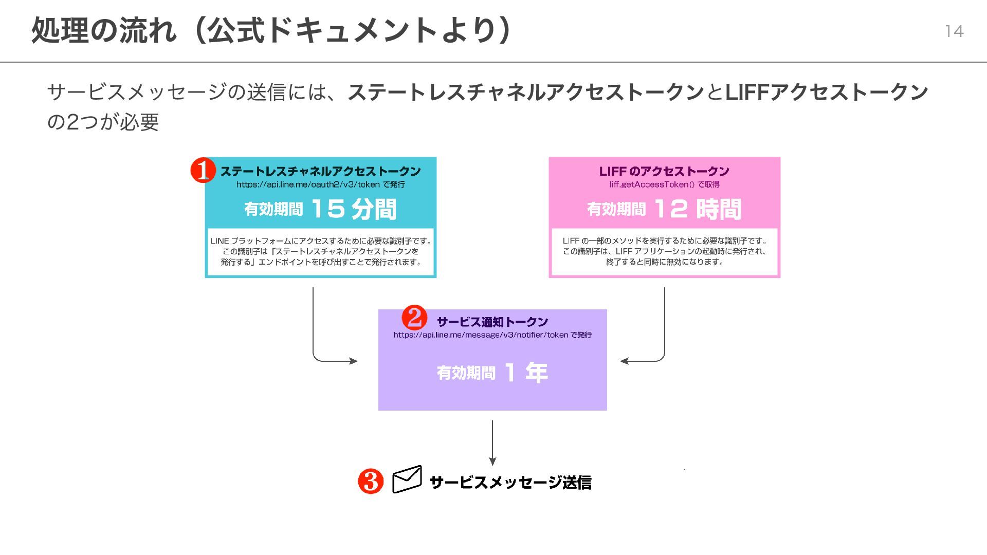 notificationToken: string, templateName: string, params: Record<string, string> ) => { const response = await fetch( "https://api.line.me/message/v3/notifier/send?target=service", { method: "POST", headers: { "Content-Type": "application/json", Authorization: `Bearer ${channelAccessToken}`, }, body: JSON.stringify({ notificationToken, templateName, params }), } ); return await response.json(); }; ポイント templateName :LINE Developersコンソールで設定したテンプレート名を指定 params :テンプレート内の変数に渡す値を設定 Step 3:サービスメッセージの送信 20