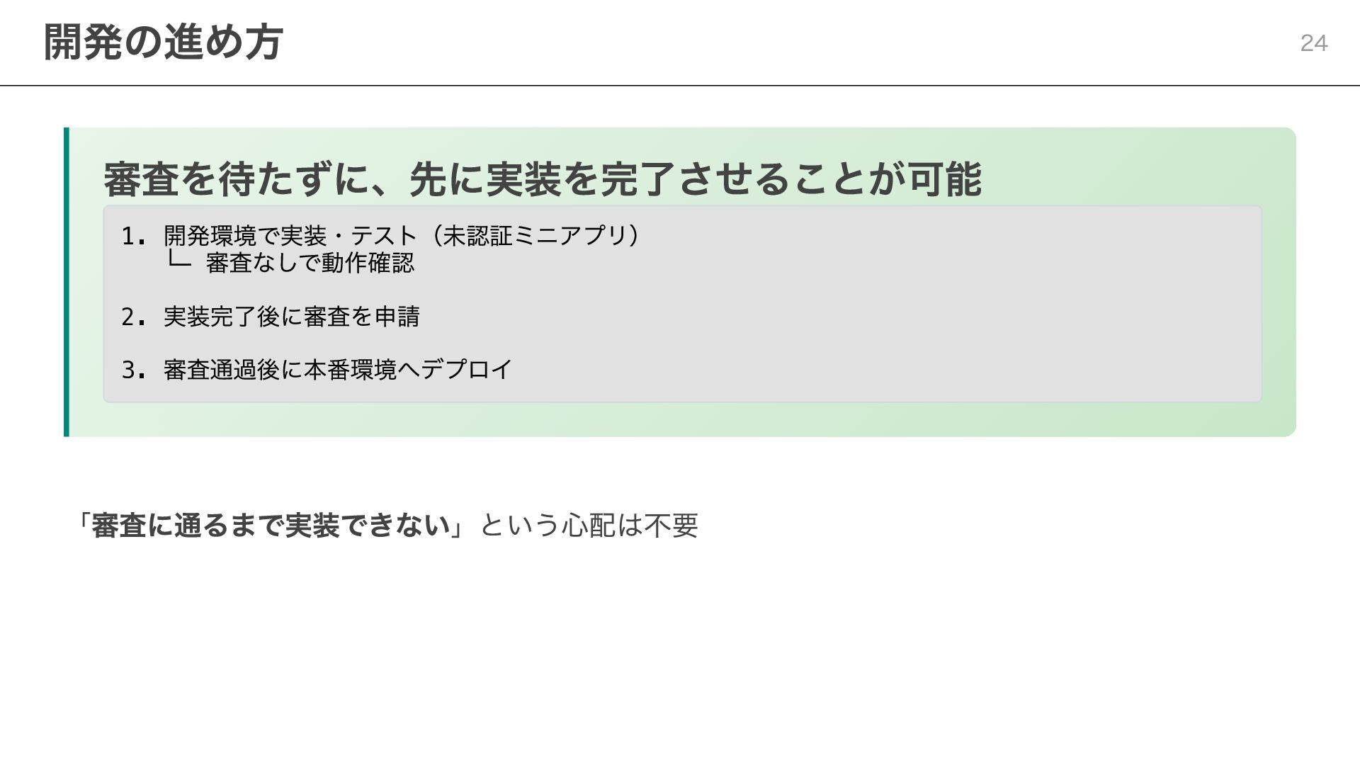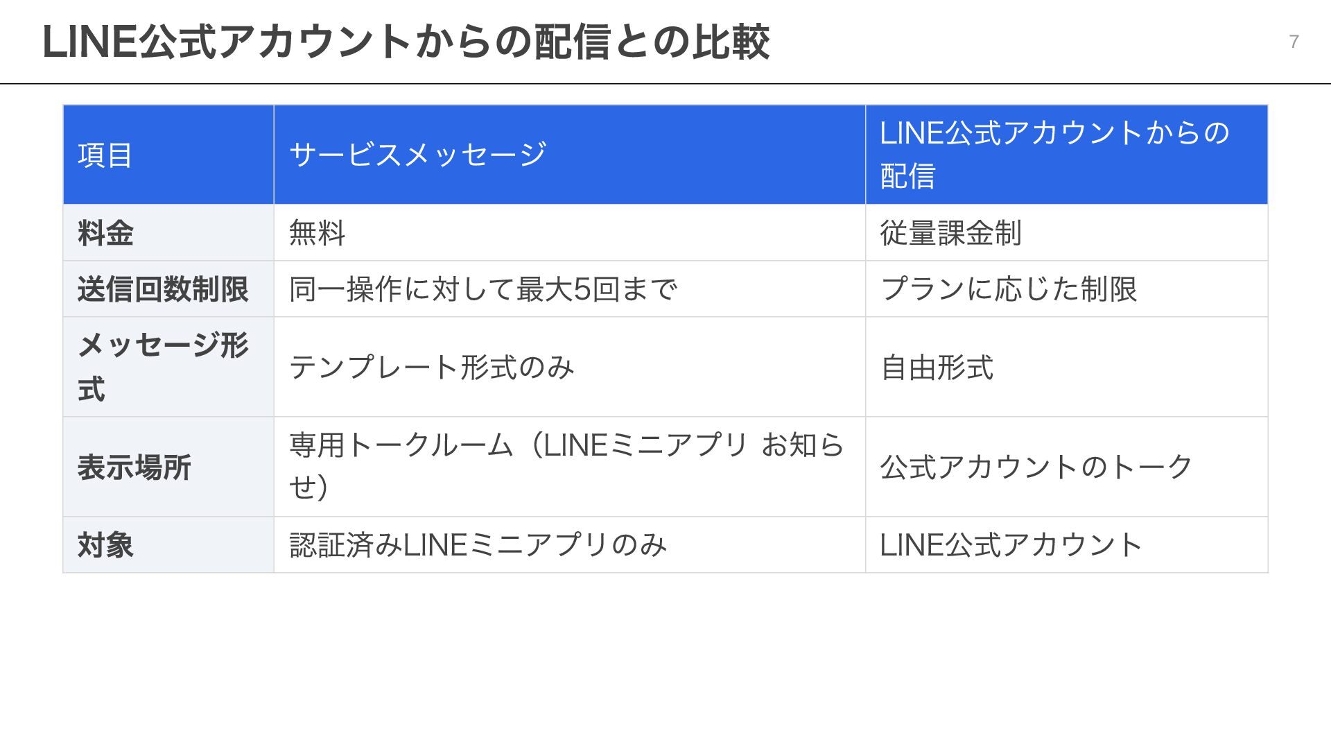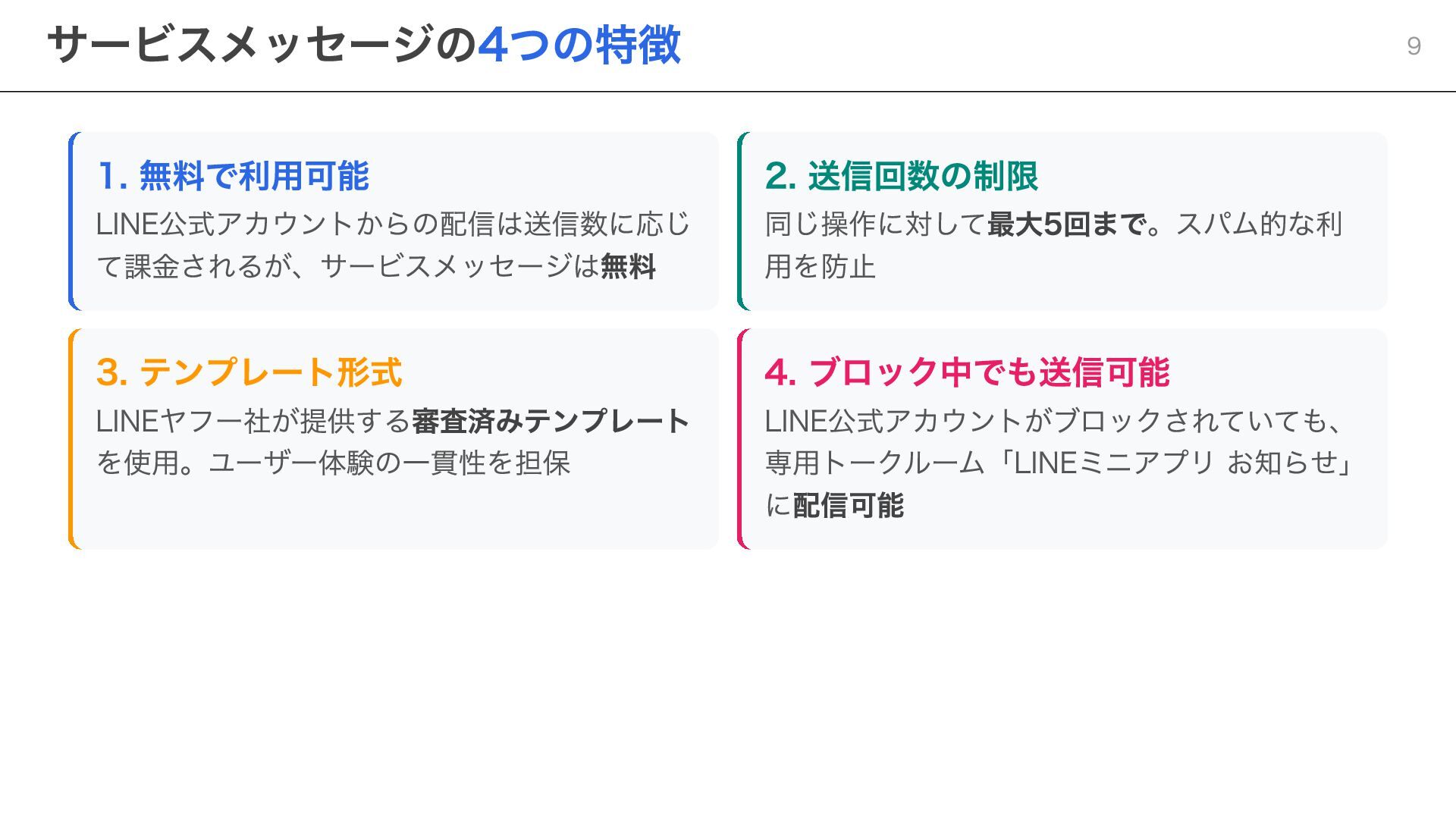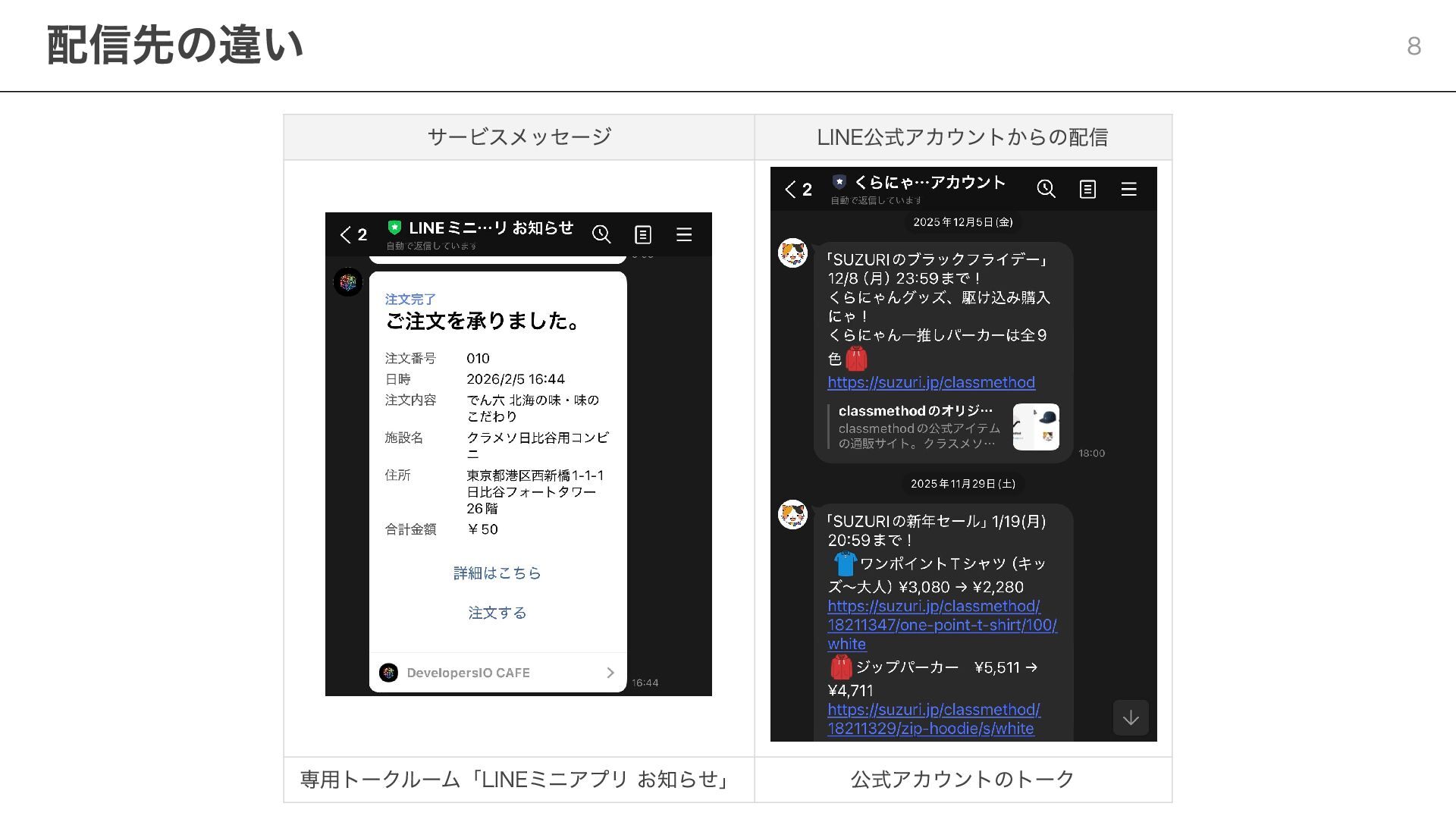 notificationToken: string, templateName: string, params: Record<string, string> ) => { const response = await fetch( "https://api.line.me/message/v3/notifier/send?target=service", { method: "POST", headers: { "Content-Type": "application/json", Authorization: `Bearer ${channelAccessToken}`, }, body: JSON.stringify({ notificationToken, templateName, params }), } ); return await response.json(); }; ポイント templateName :LINE Developersコンソールで設定したテンプレート名を指定 params :テンプレート内の変数に渡す値を設定 Step 3:サービスメッセージの送信 20