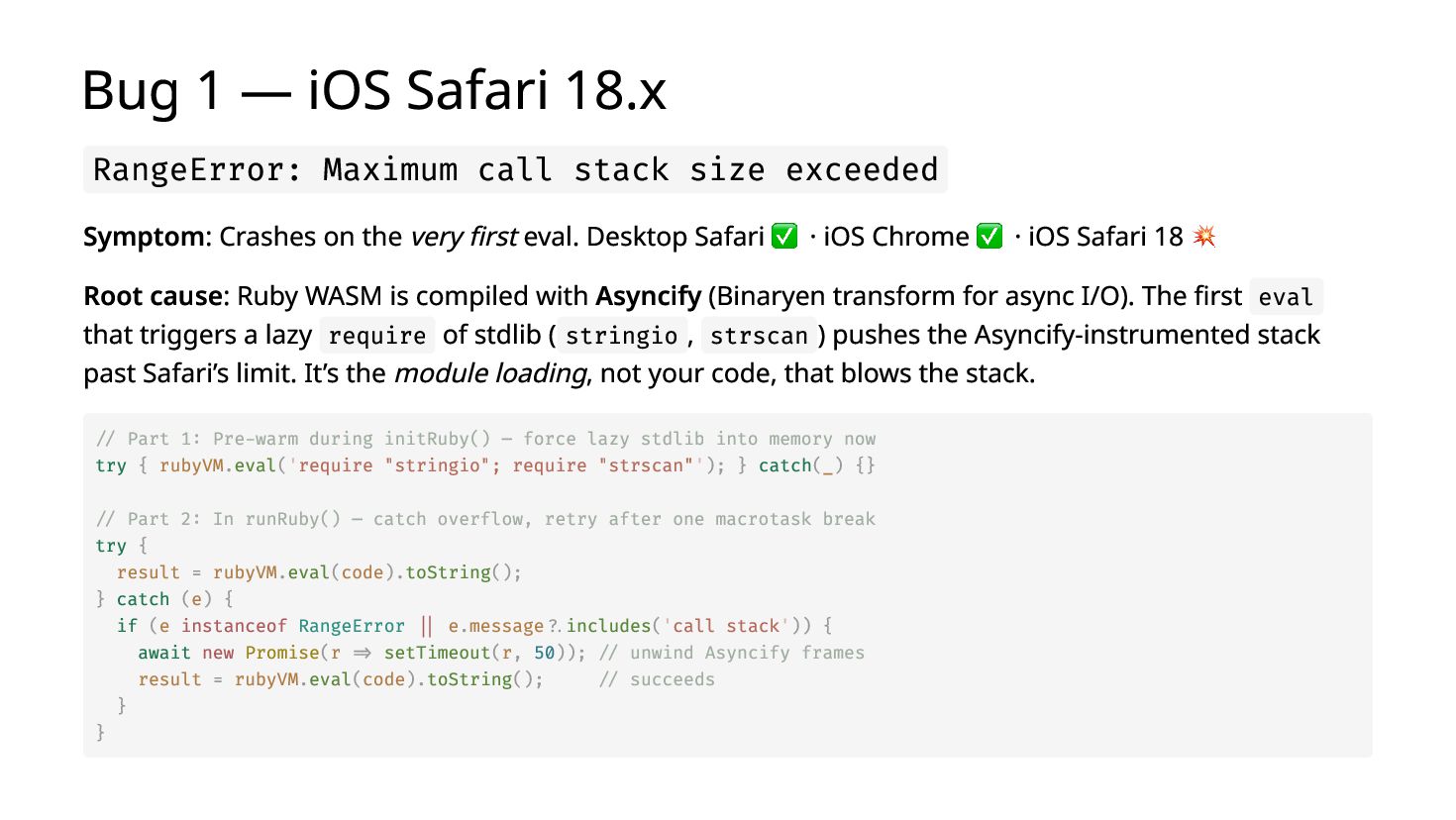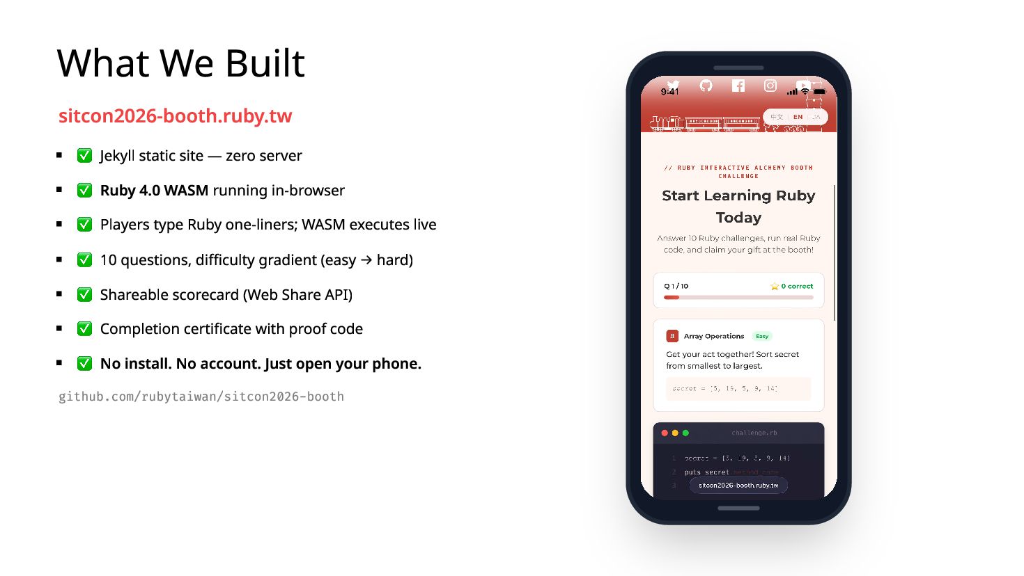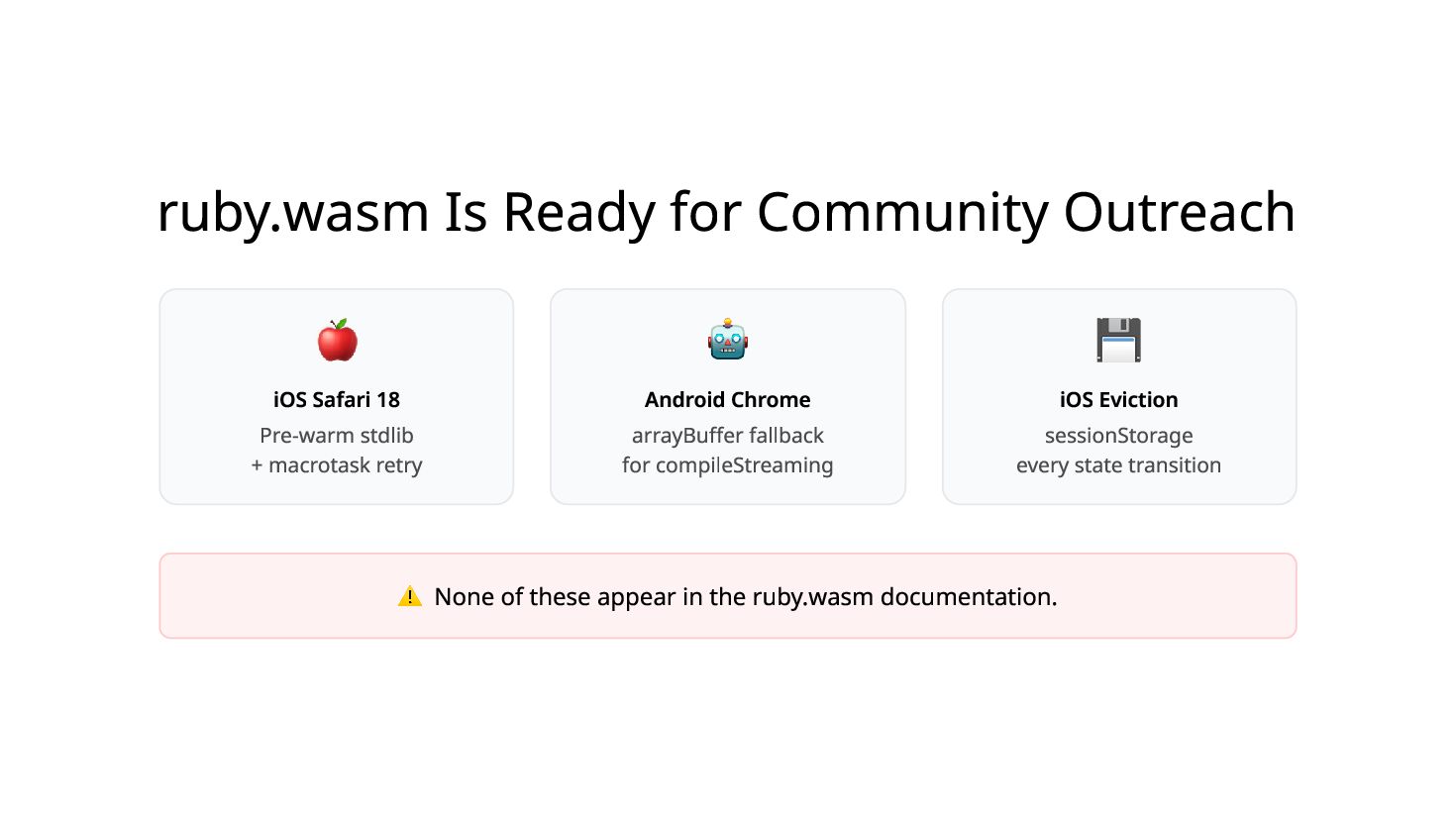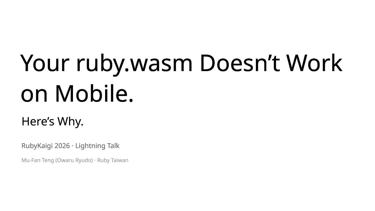 You ship a ruby.wasm app. It works on your MacBook. You bring it to a conference booth, hand it to a stranger on their iPhone — it crashes. The next person's Android freezes with no error. A third player comes back from a break and their quiz progress is gone. I hit all three at SITCON 2026 which is the only open source conference for students, running a Ruby quiz game powered by Ruby 4.0 WASM in-browser, designed to introduce Ruby to people who had never written a line of it. Each failure has a root cause and a fix under 10 lines. I'll show you all three.