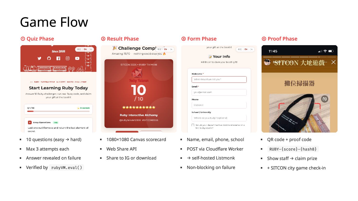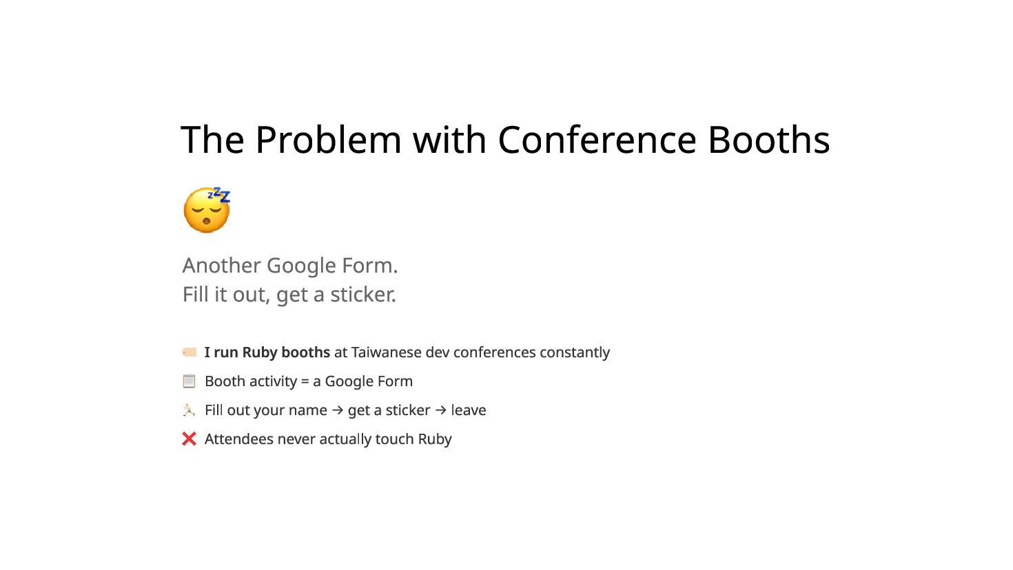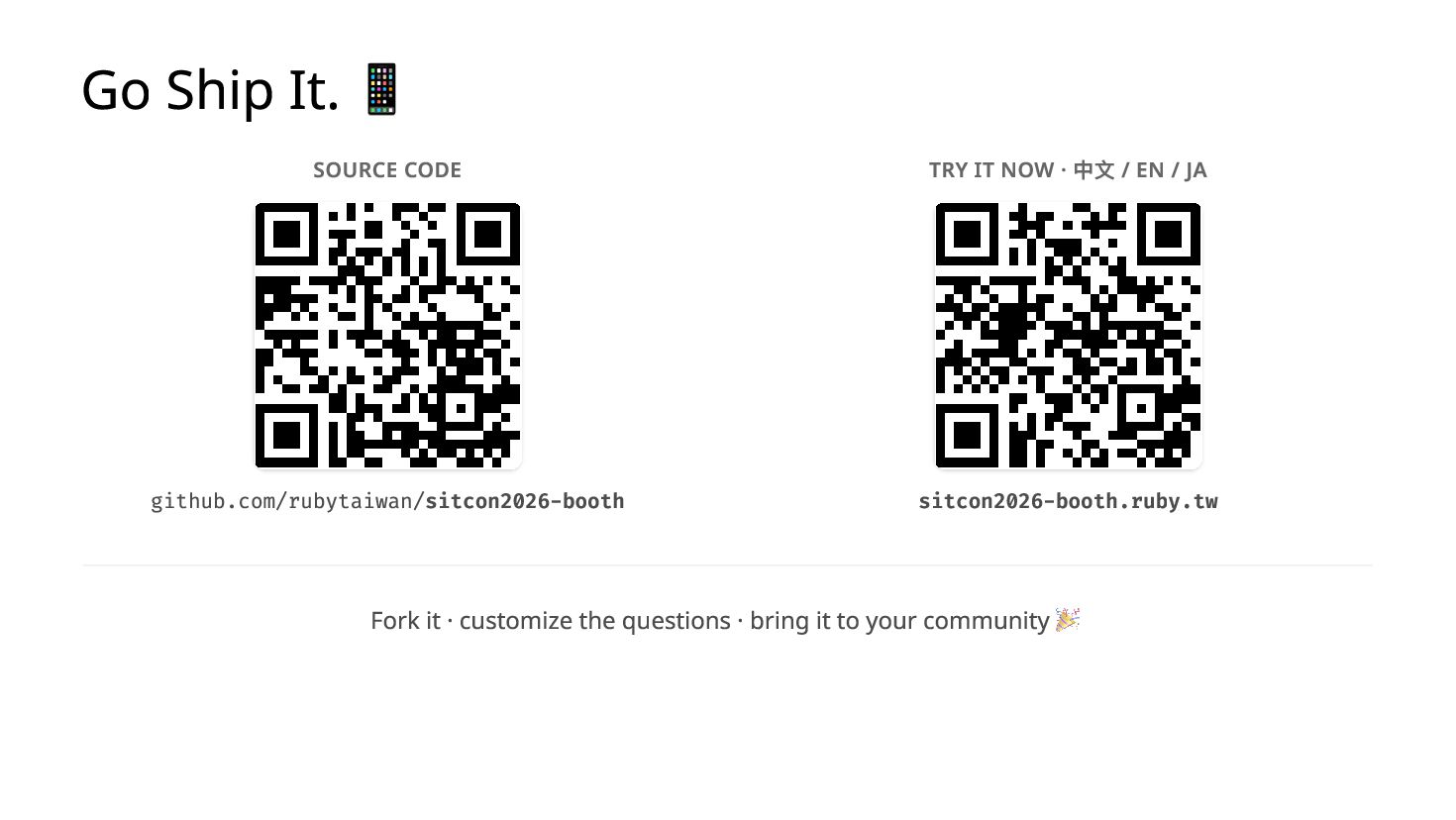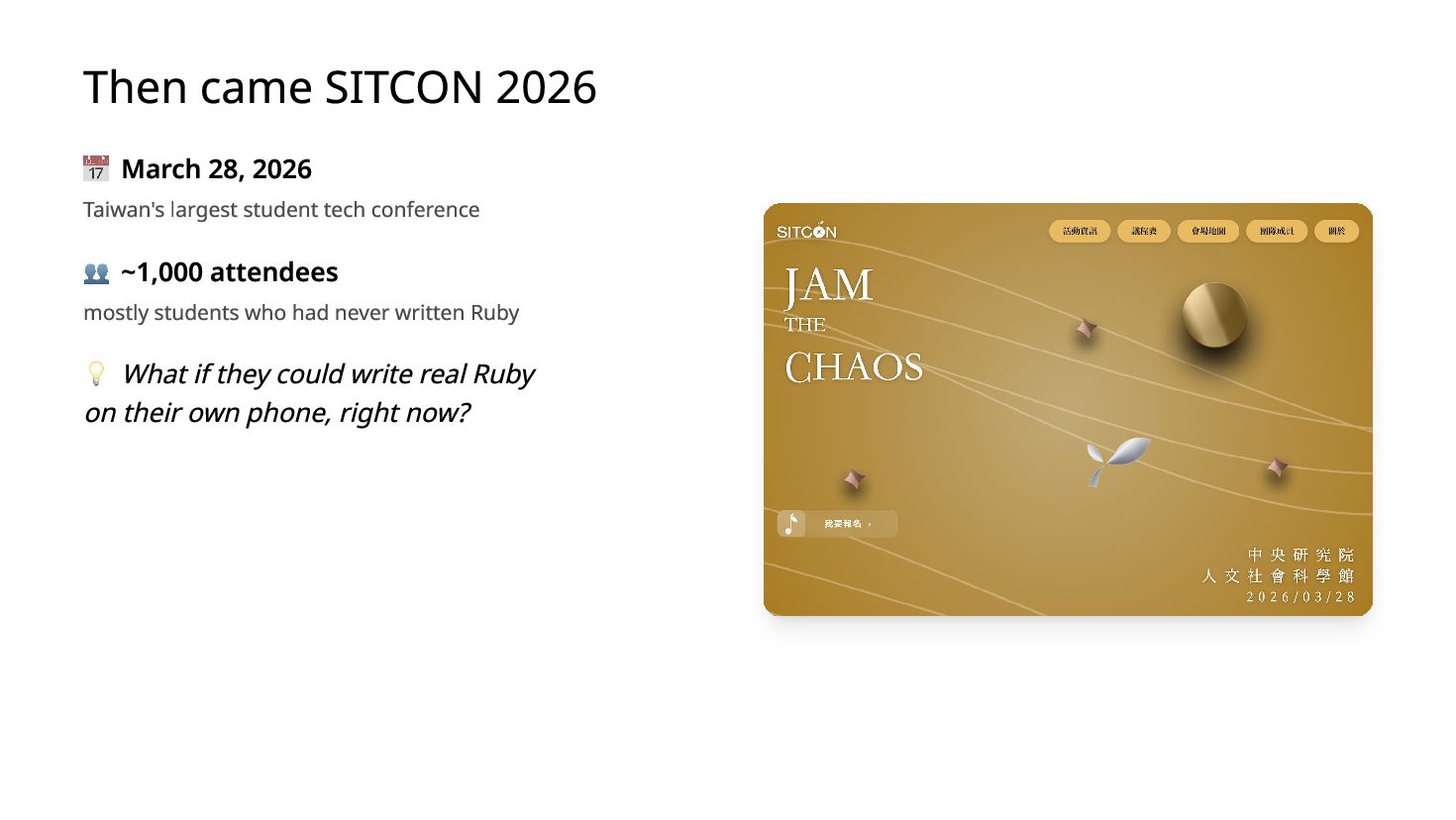 You ship a ruby.wasm app. It works on your MacBook. You bring it to a conference booth, hand it to a stranger on their iPhone — it crashes. The next person's Android freezes with no error. A third player comes back from a break and their quiz progress is gone. I hit all three at SITCON 2026 which is the only open source conference for students, running a Ruby quiz game powered by Ruby 4.0 WASM in-browser, designed to introduce Ruby to people who had never written a line of it. Each failure has a root cause and a fix under 10 lines. I'll show you all three.