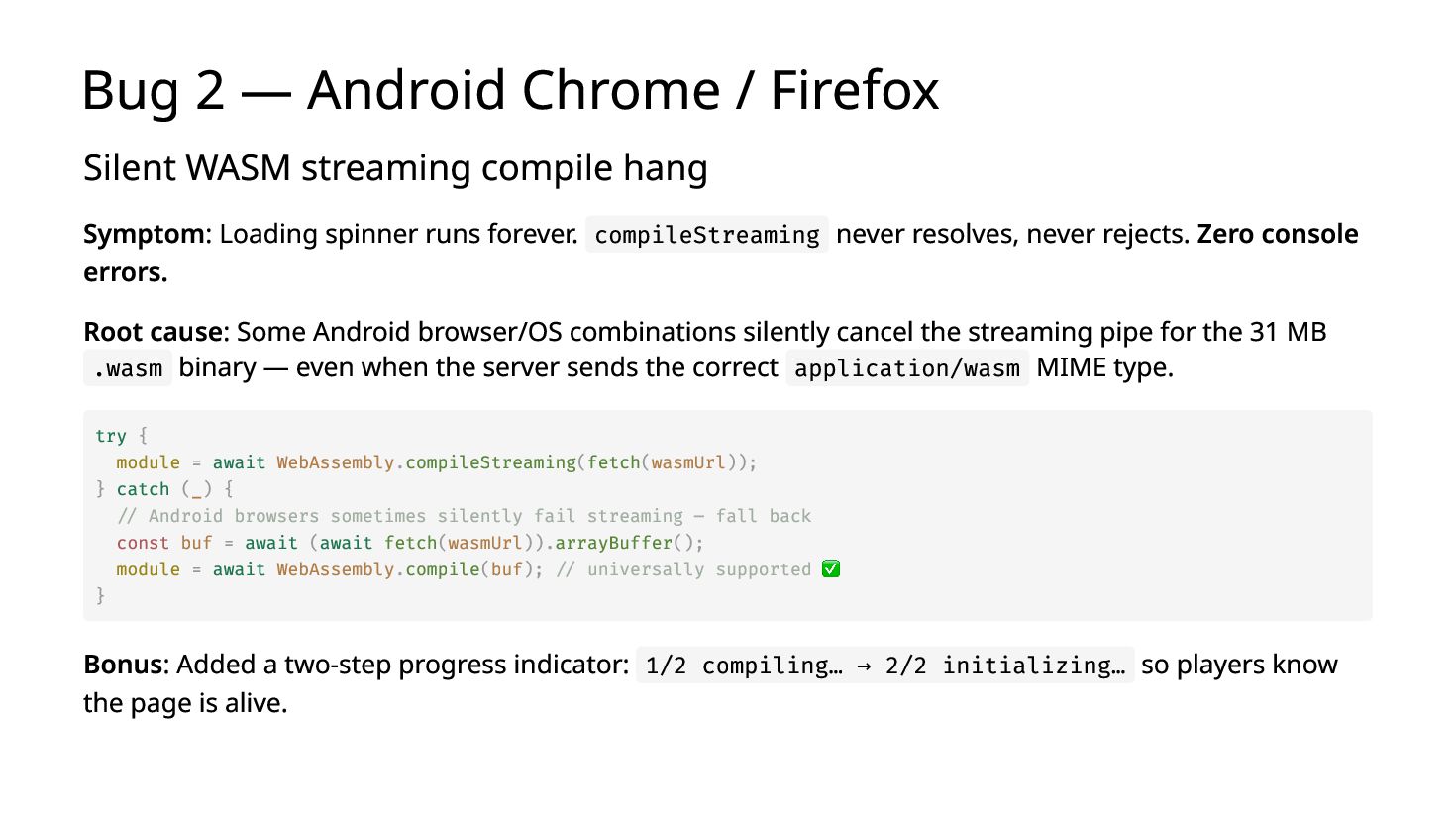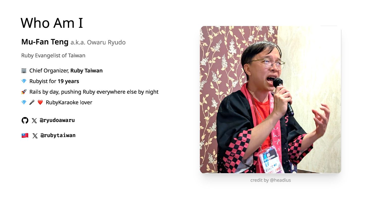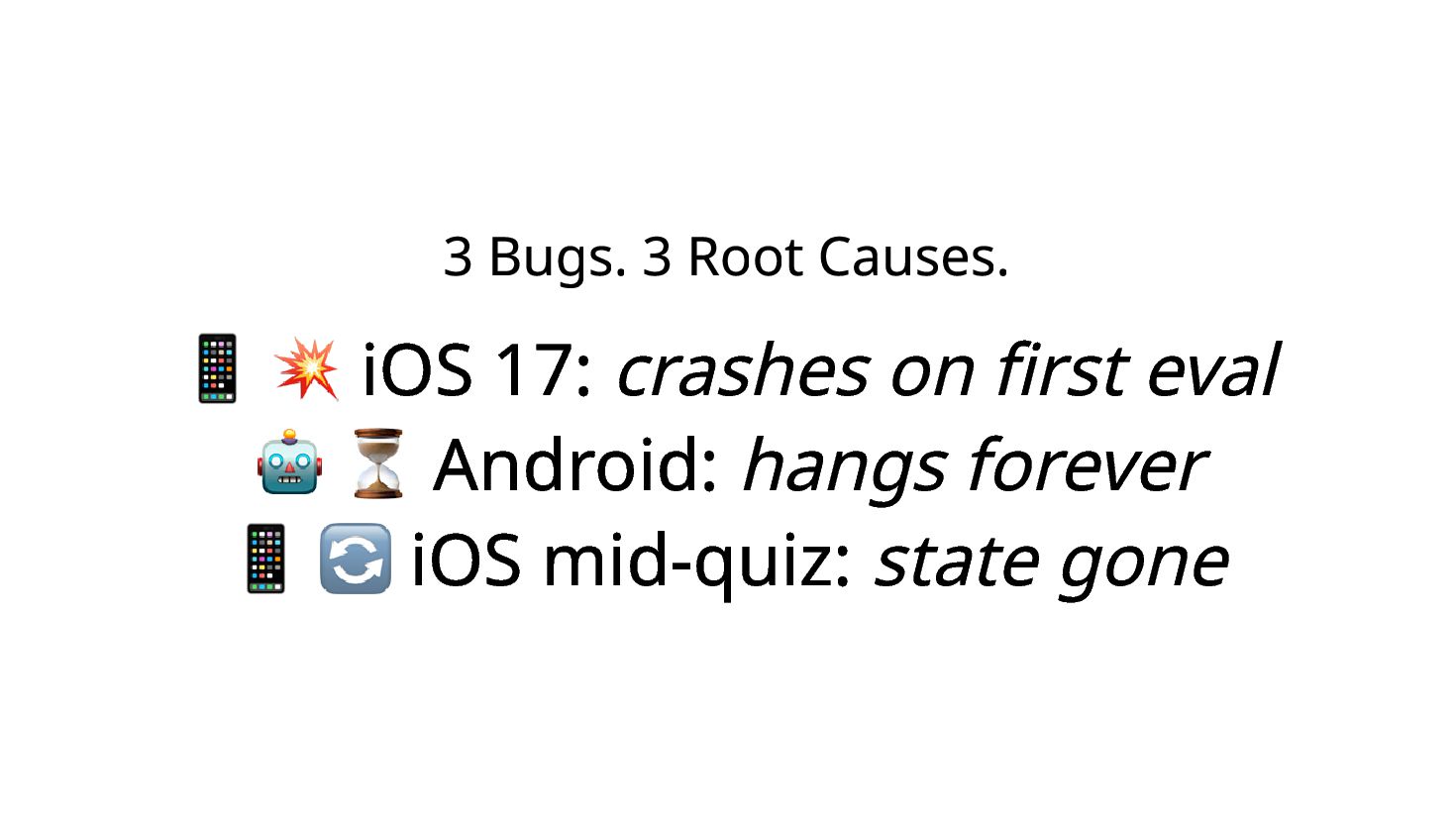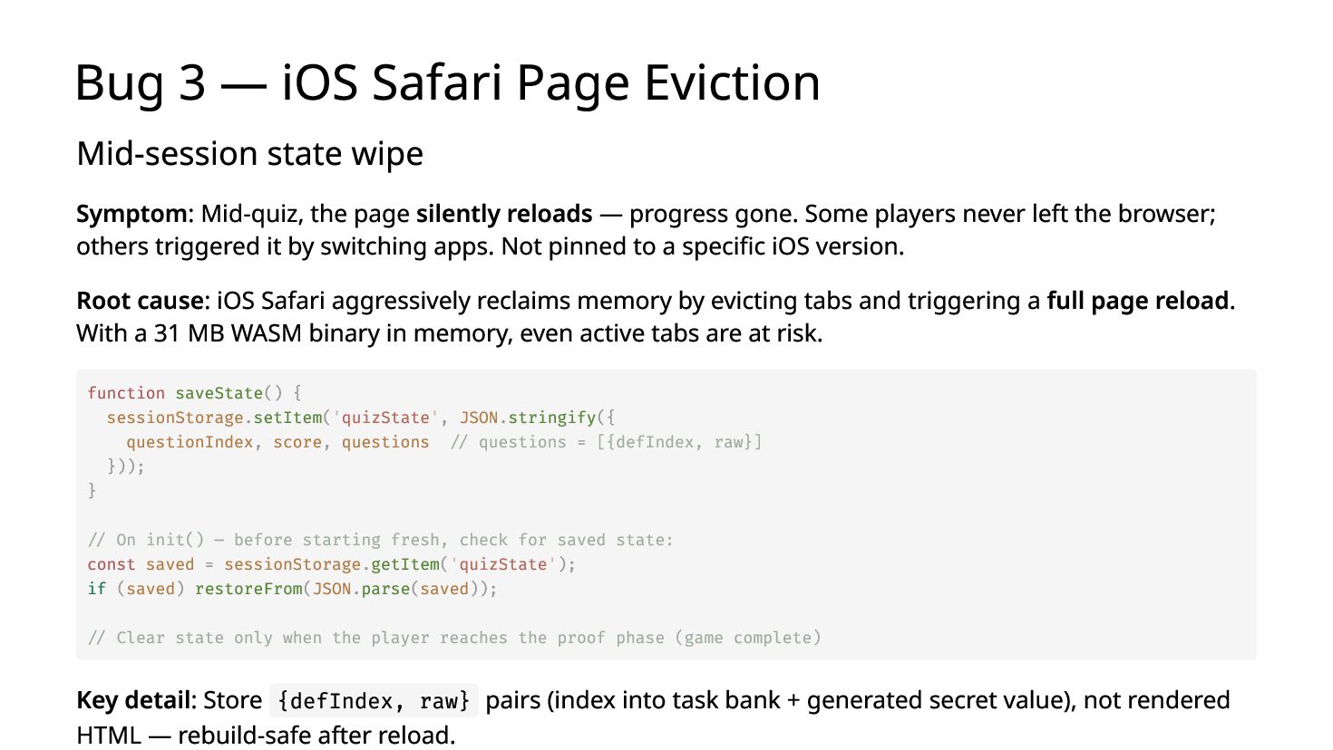 You ship a ruby.wasm app. It works on your MacBook. You bring it to a conference booth, hand it to a stranger on their iPhone — it crashes. The next person's Android freezes with no error. A third player comes back from a break and their quiz progress is gone. I hit all three at SITCON 2026 which is the only open source conference for students, running a Ruby quiz game powered by Ruby 4.0 WASM in-browser, designed to introduce Ruby to people who had never written a line of it. Each failure has a root cause and a fix under 10 lines. I'll show you all three.