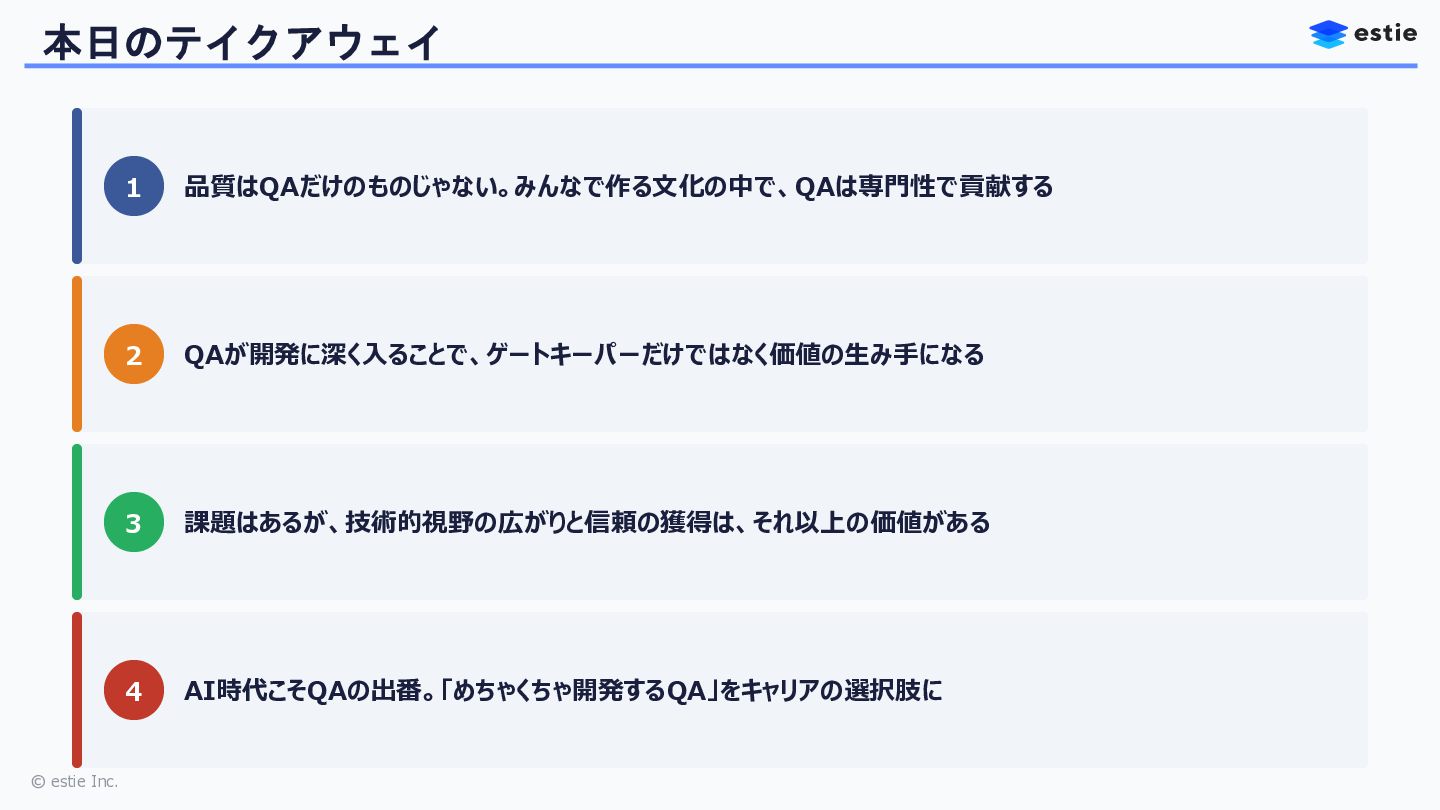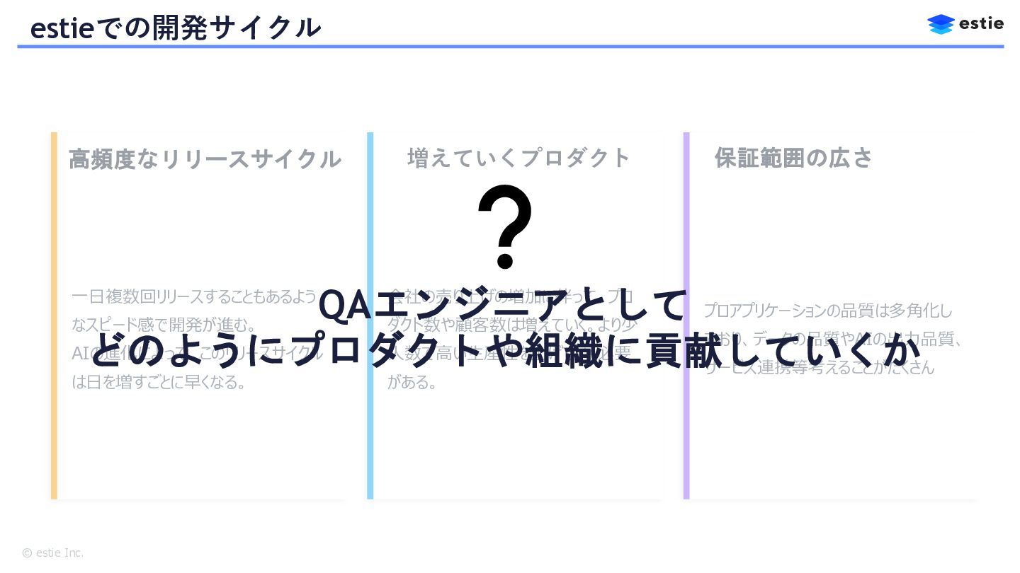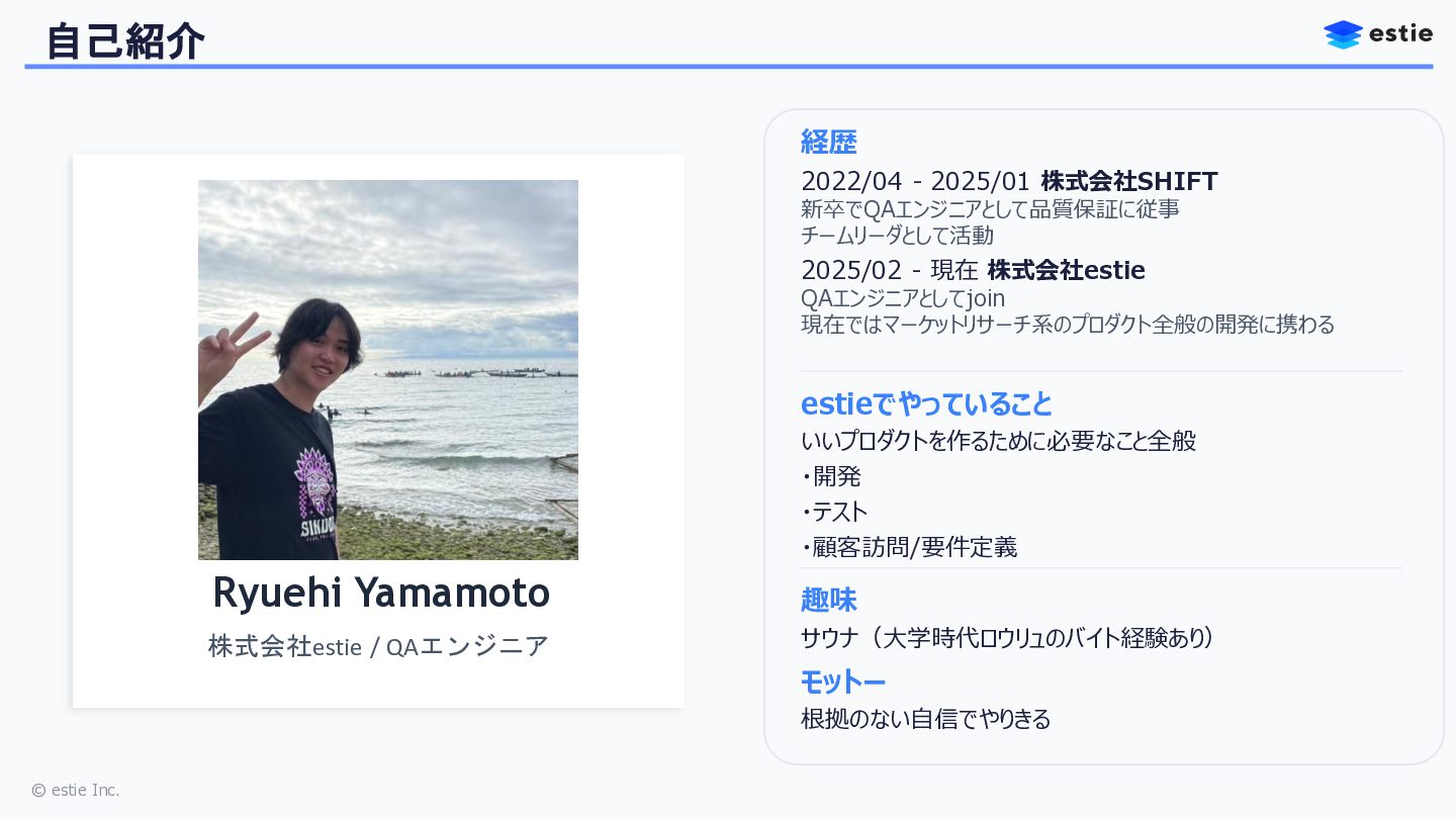本セッションでは、株式会社estieにおいて、QAの枠を超えてバックエンドやフロントエンドの開発を自ら担う道を選んだQAエンジニアの挑戦を共有します。
