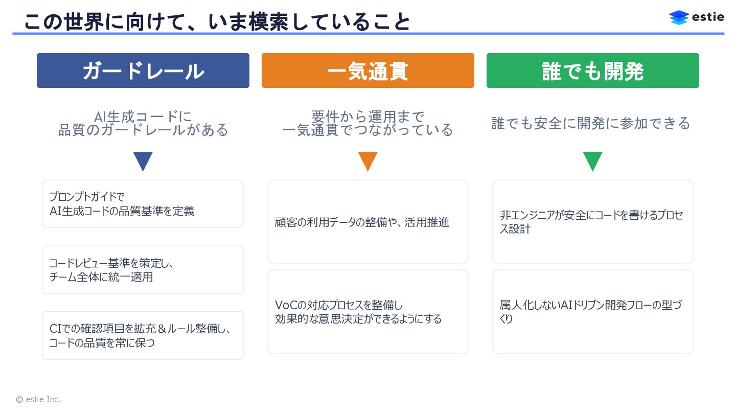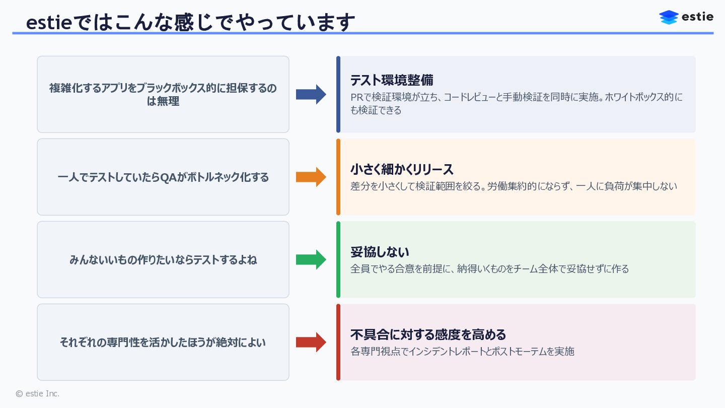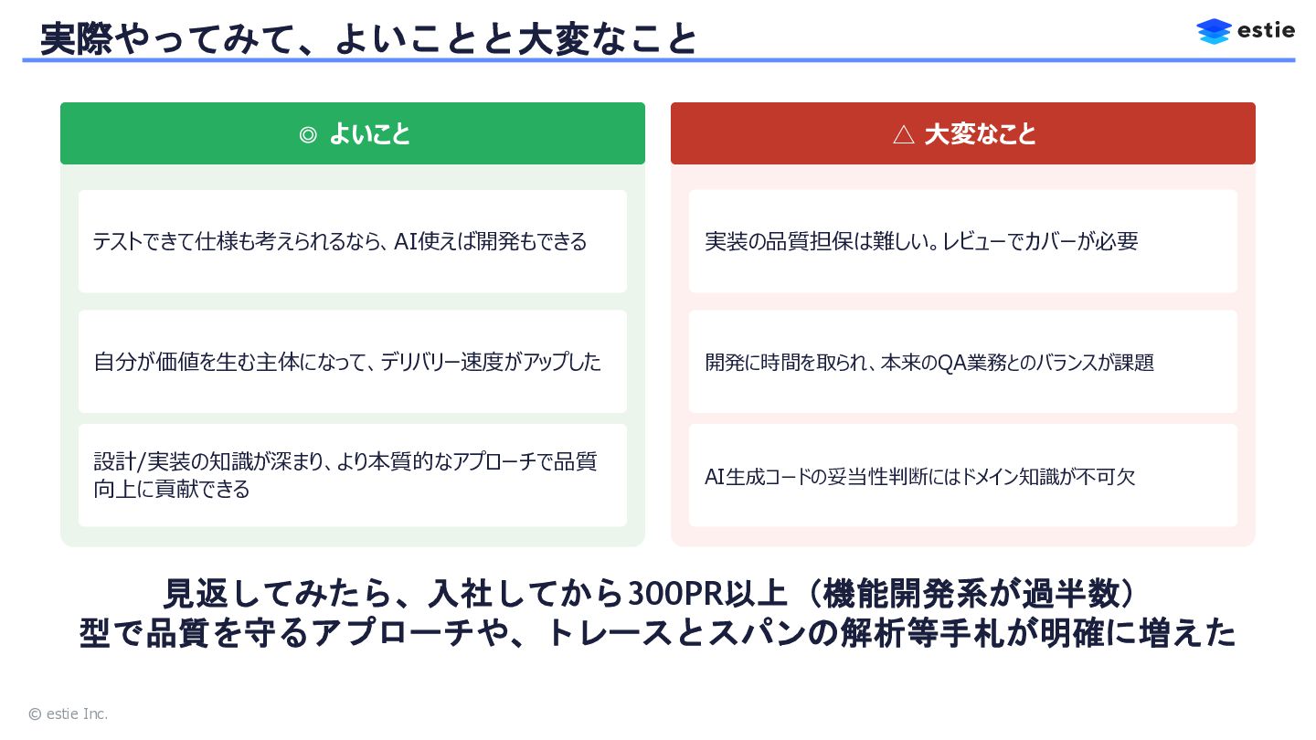本セッションでは、株式会社estieにおいて、QAの枠を超えてバックエンドやフロントエンドの開発を自ら担う道を選んだQAエンジニアの挑戦を共有します。