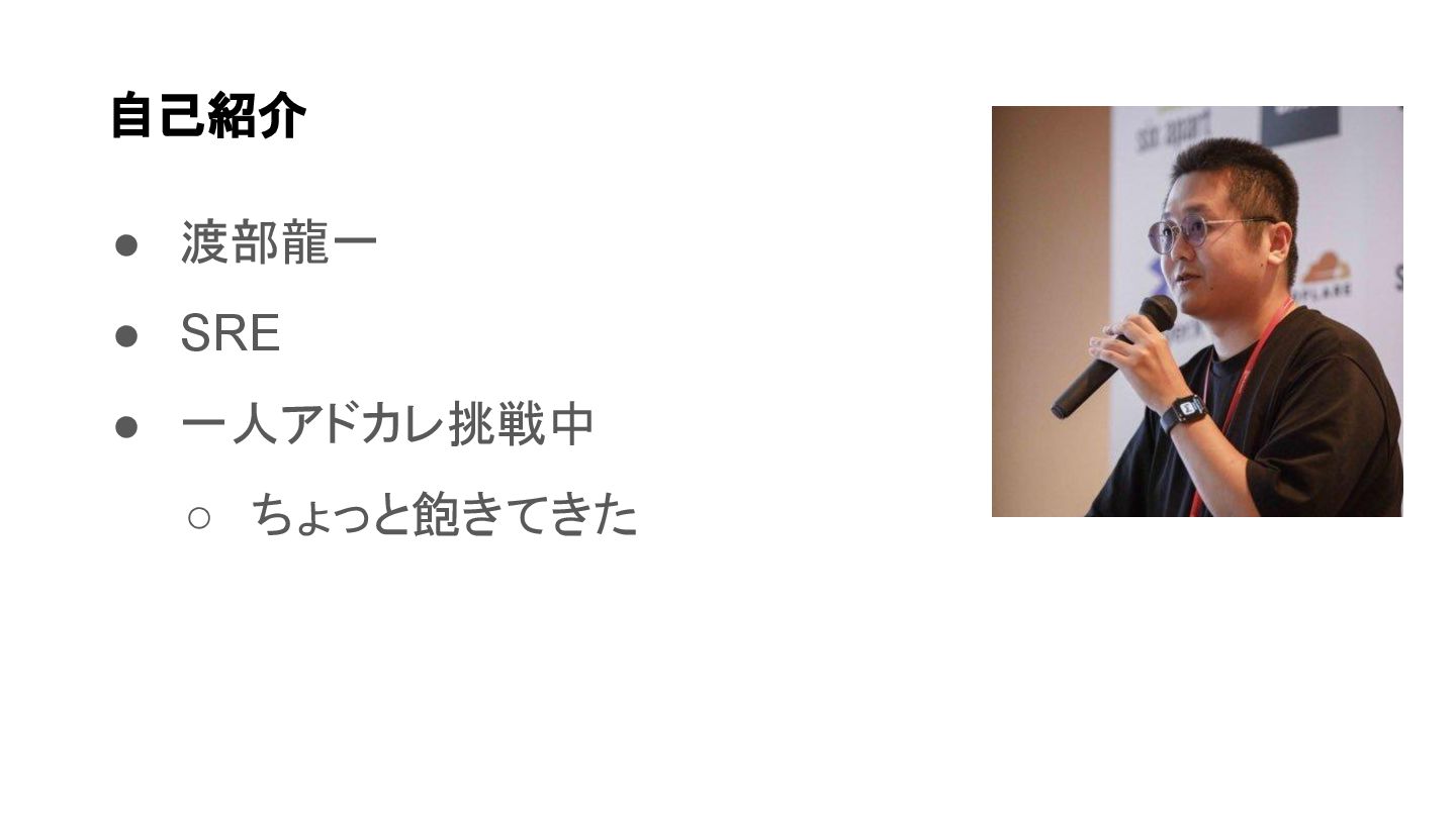 • 渡部龍一 • SRE • 一人アドカレ挑戦中 ◦ ちょっと飽きてきた 自己紹介
