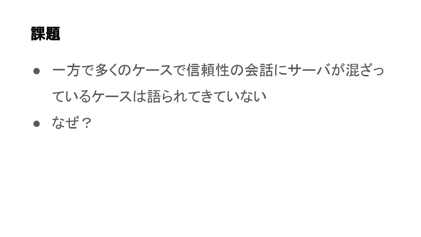 • 一方で多くのケースで信頼性の会話にサーバが混ざっ ているケースは語られてきていない • なぜ? 課題