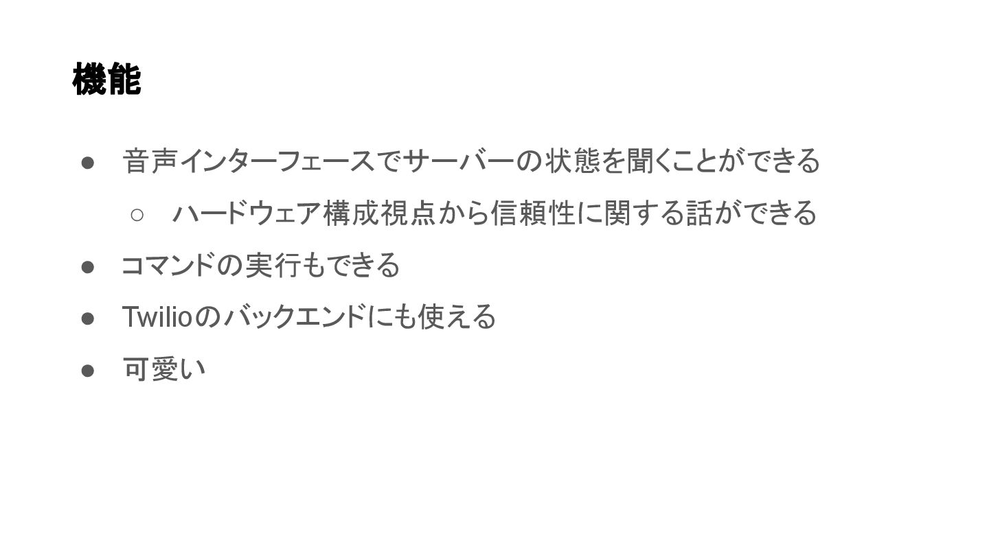 • 音声インターフェースでサーバーの状態を聞くことができる ◦ ハードウェア構成視点から信頼性に関する話ができる • コマンドの実行もできる • Twilioのバックエンドにも使える • 可愛い