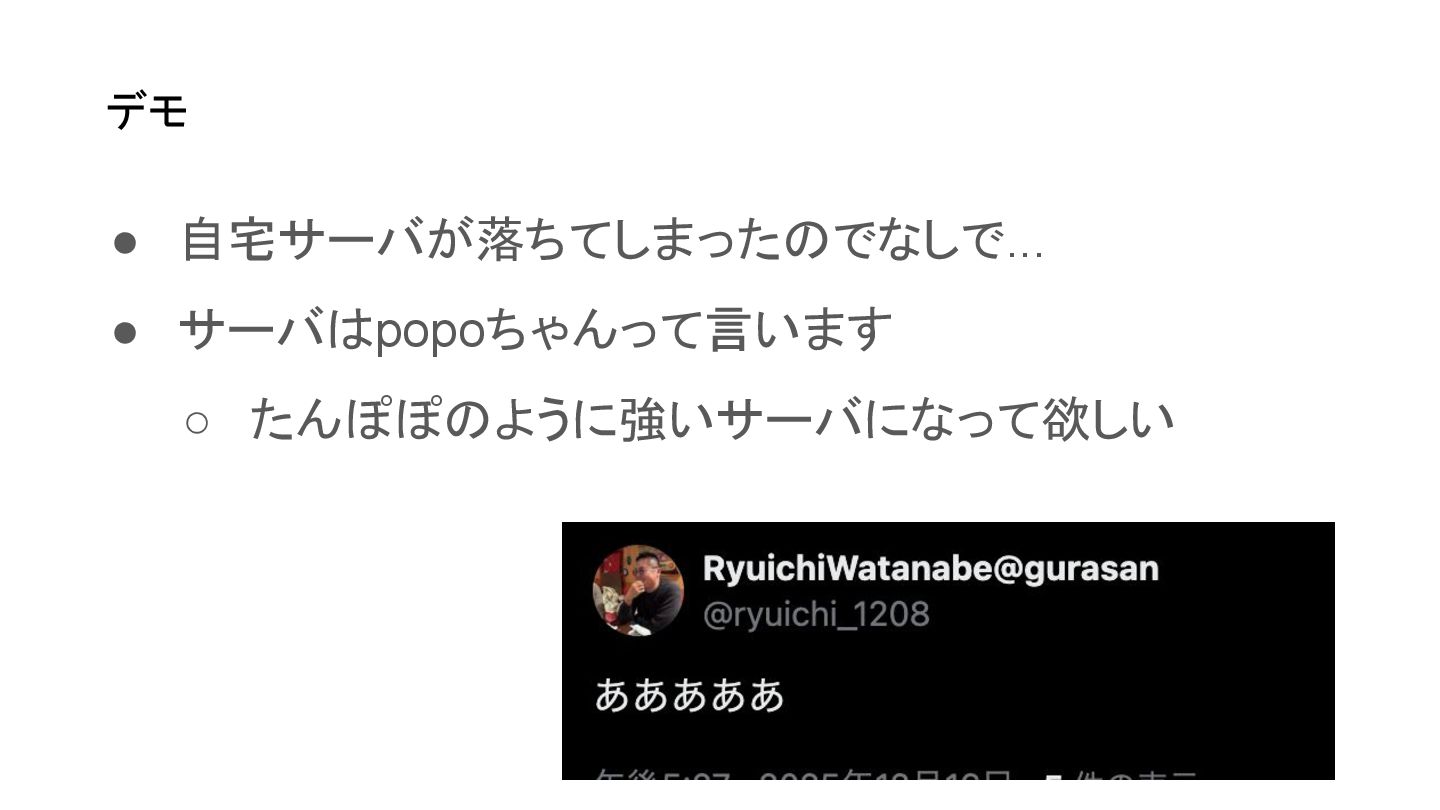 デモ • 自宅サーバが落ちてしまったのでなしで... • サーバはpopoちゃんって言います ◦ たんぽぽのように強いサーバになって欲しい