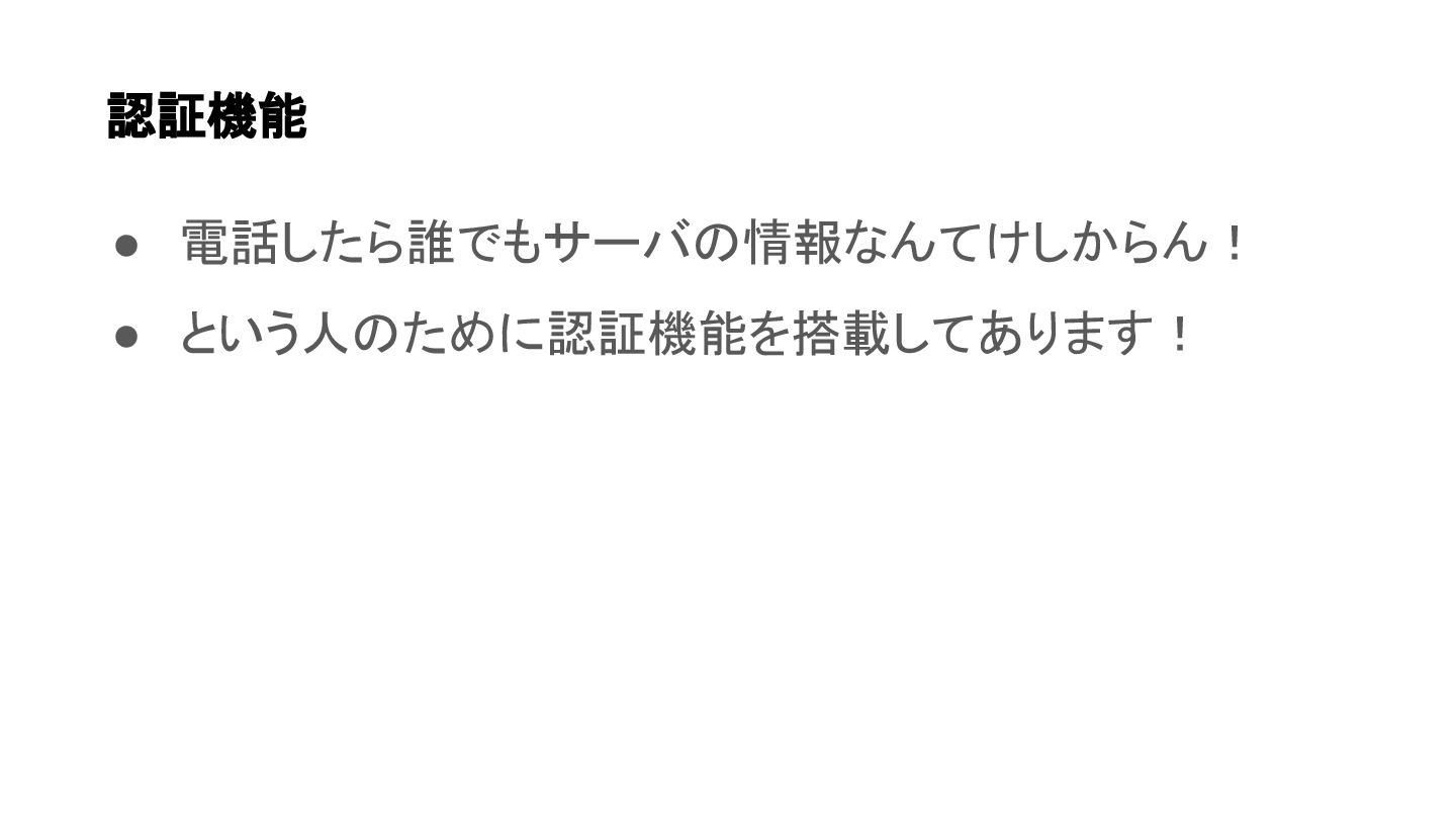 • 電話したら誰でもサーバの情報なんてけしからん! • という人のために認証機能を搭載してあります! 認証機能