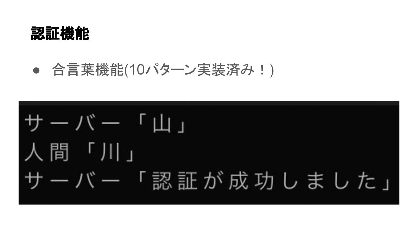 • 合言葉機能(10パターン実装済み!) 認証機能