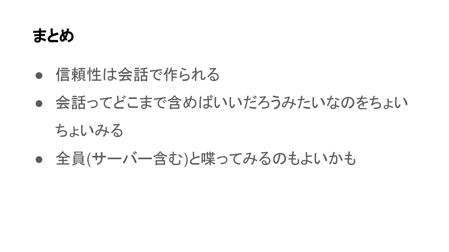 • 信頼性は会話で作られる • 会話ってどこまで含めばいいだろうみたいなのをちょい ちょいみる • 全員(サーバー含む)と喋ってみるのもよいかも まとめ