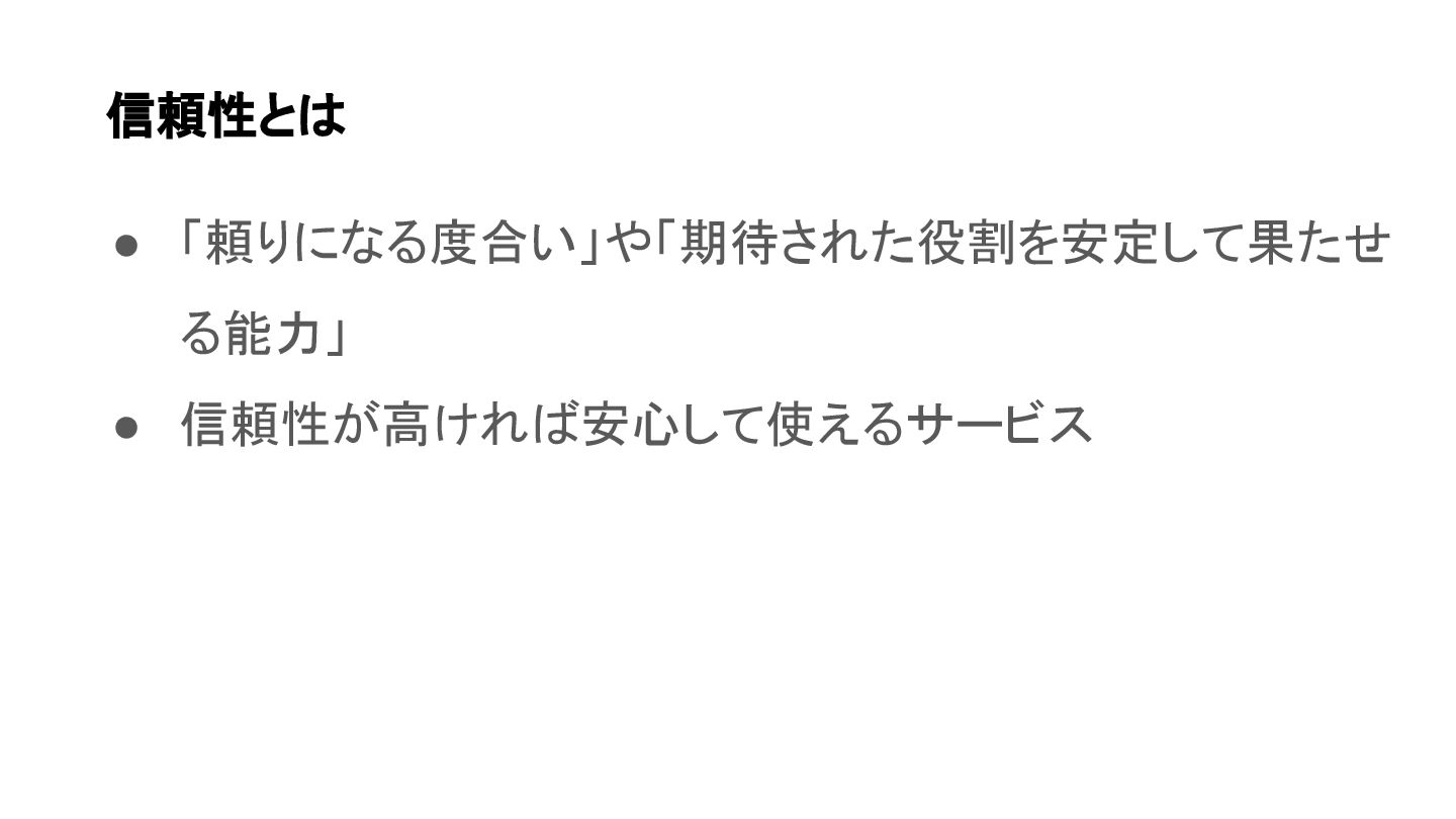 • 「頼りになる度合い」や「期待された役割を安定して果たせ る能力」 • 信頼性が高ければ安心して使えるサービス 信頼性とは