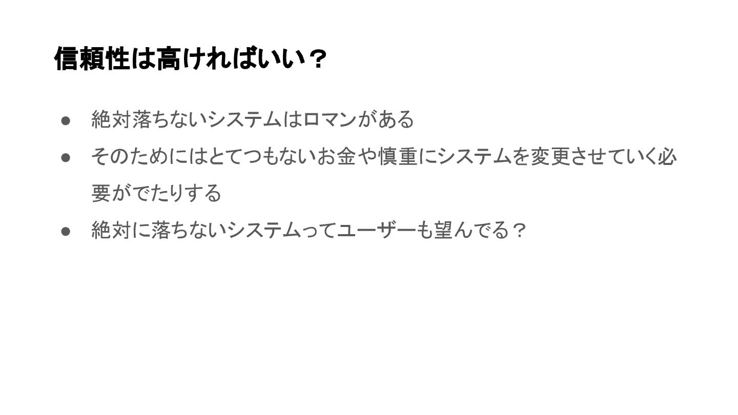 • 絶対落ちないシステムはロマンがある • そのためにはとてつもないお金や慎重にシステムを変更させていく必 要がでたりする • 絶対に落ちないシステムってユーザーも望んでる? 信頼性は高ければいい?