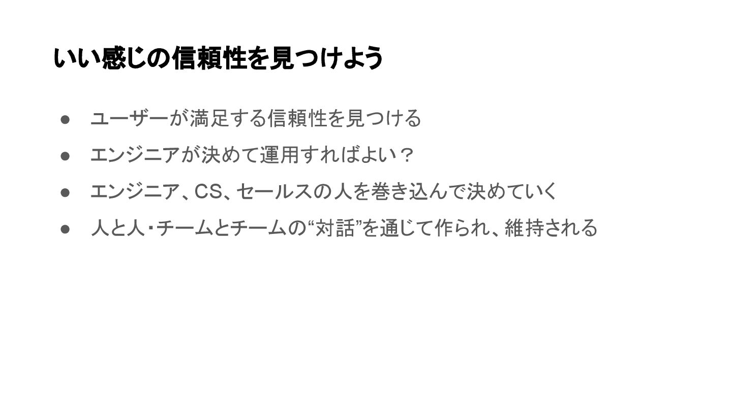 • ユーザーが満足する信頼性を見つける • エンジニアが決めて運用すればよい? • エンジニア、CS、セールスの人を巻き込んで決めていく • 人と人・チームとチームの“対話”を通じて作られ、維持される いい感じの信頼性を見つけよう