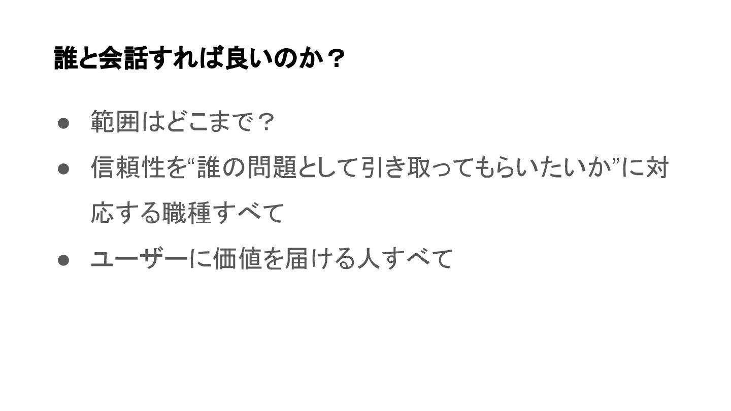 • 範囲はどこまで? • 信頼性を“誰の問題として引き取ってもらいたいか”に対 応する職種すべて • ユーザーに価値を届ける人すべて 誰と会話すれば良いのか?