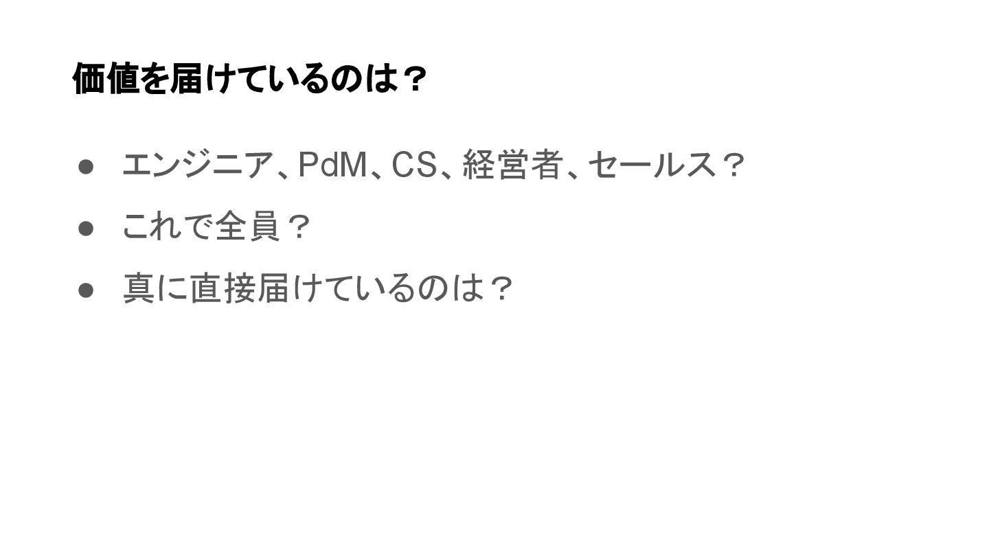 • エンジニア、PdM、CS、経営者、セールス? • これで全員? • 真に直接届けているのは? 価値を届けているのは?
