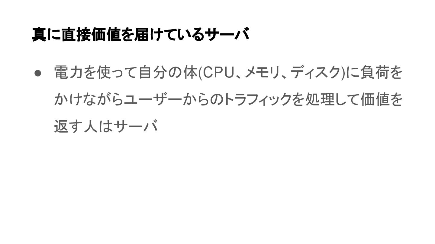 • 電力を使って自分の体(CPU、メモリ、ディスク)に負荷を かけながらユーザーからのトラフィックを処理して価値を 返す人はサーバ 真に直接価値を届けているサーバ