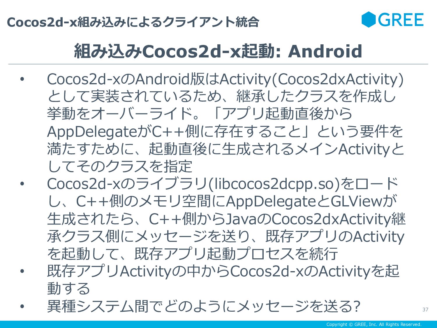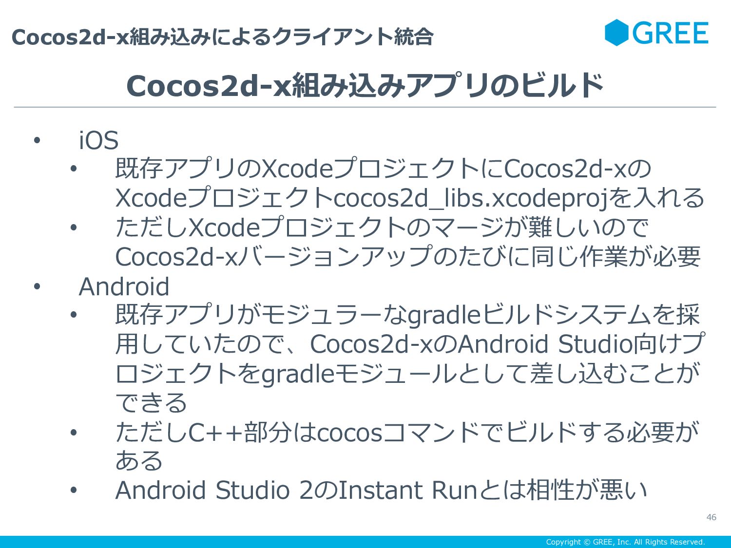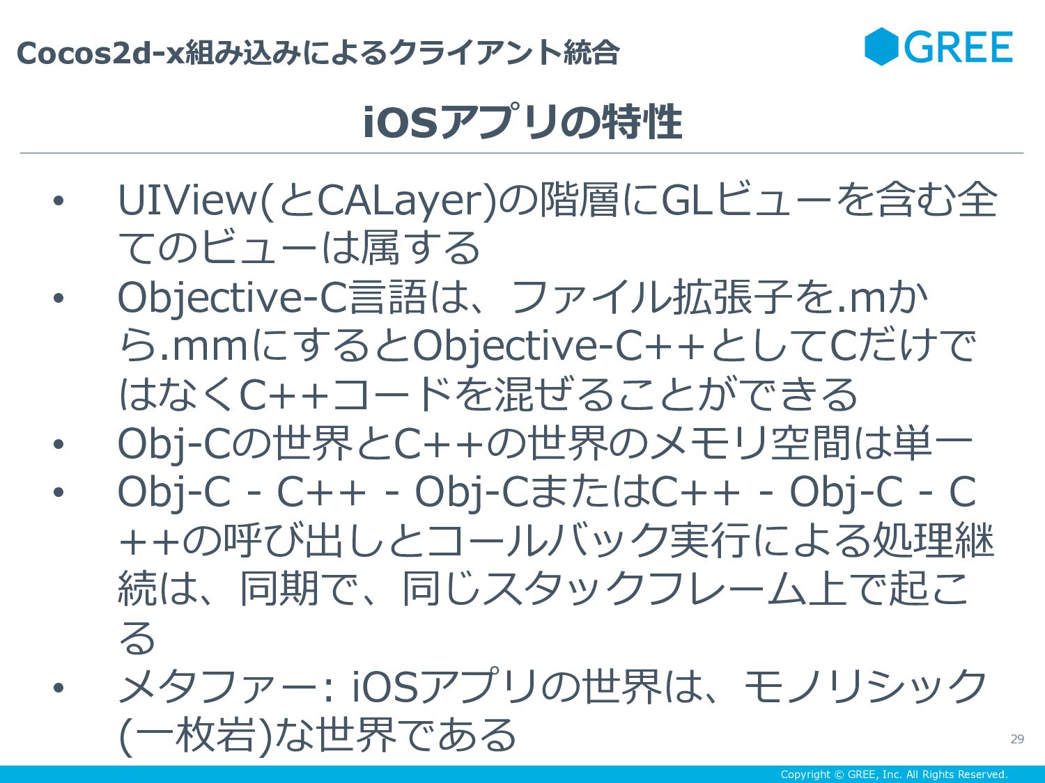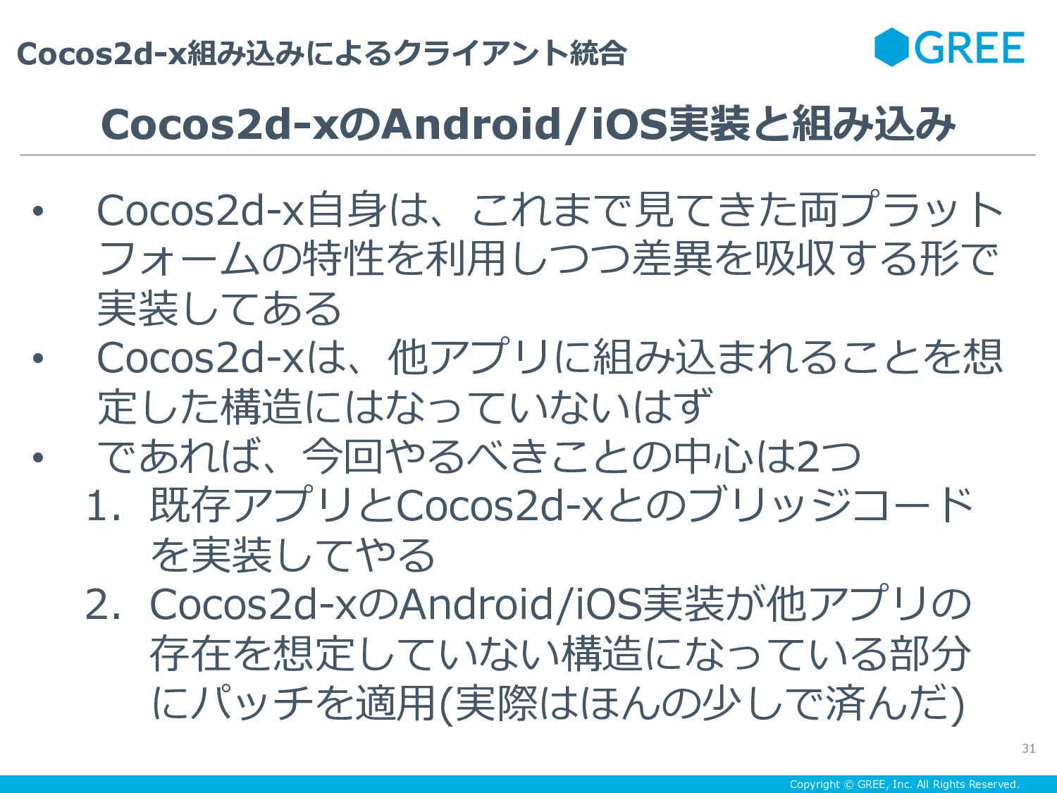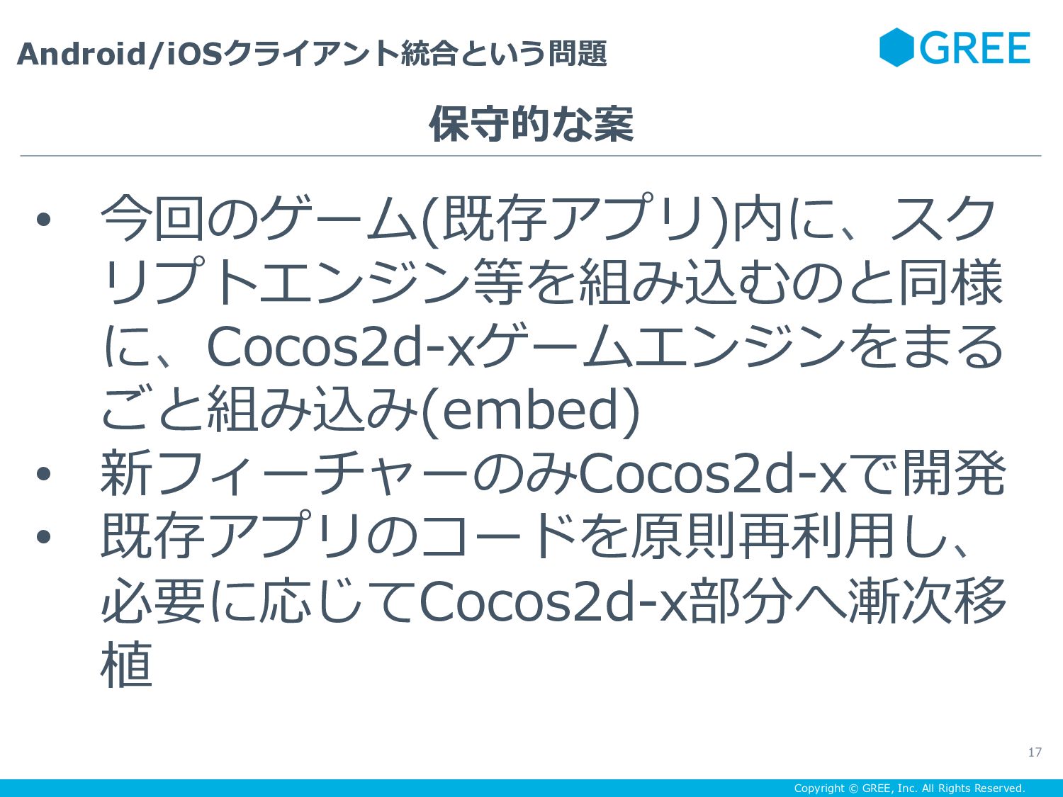 ピュアJavaまたはObjective-Cで別個に開発されたAndroid/iOS各プラットフォーム向けクライアントコードベースを、Cocos2d-xへの単純移植ではなく、既存アプリへのプラグインのようにCocos2d-x自体をまるごと組み込むこと(embed)により、移行のコストとリスクを最小限に抑制しつつ統合してゆく手法をご紹介いたします。